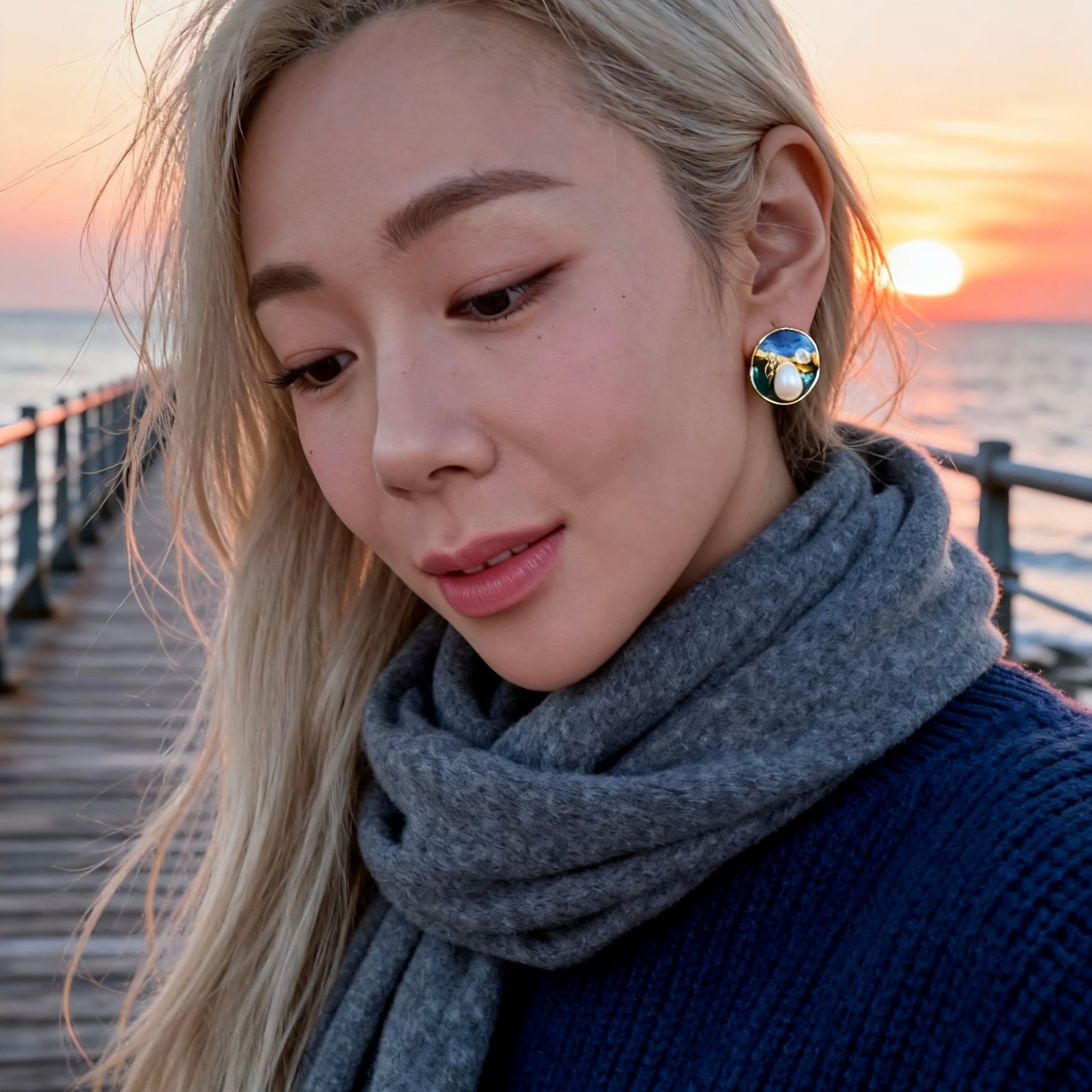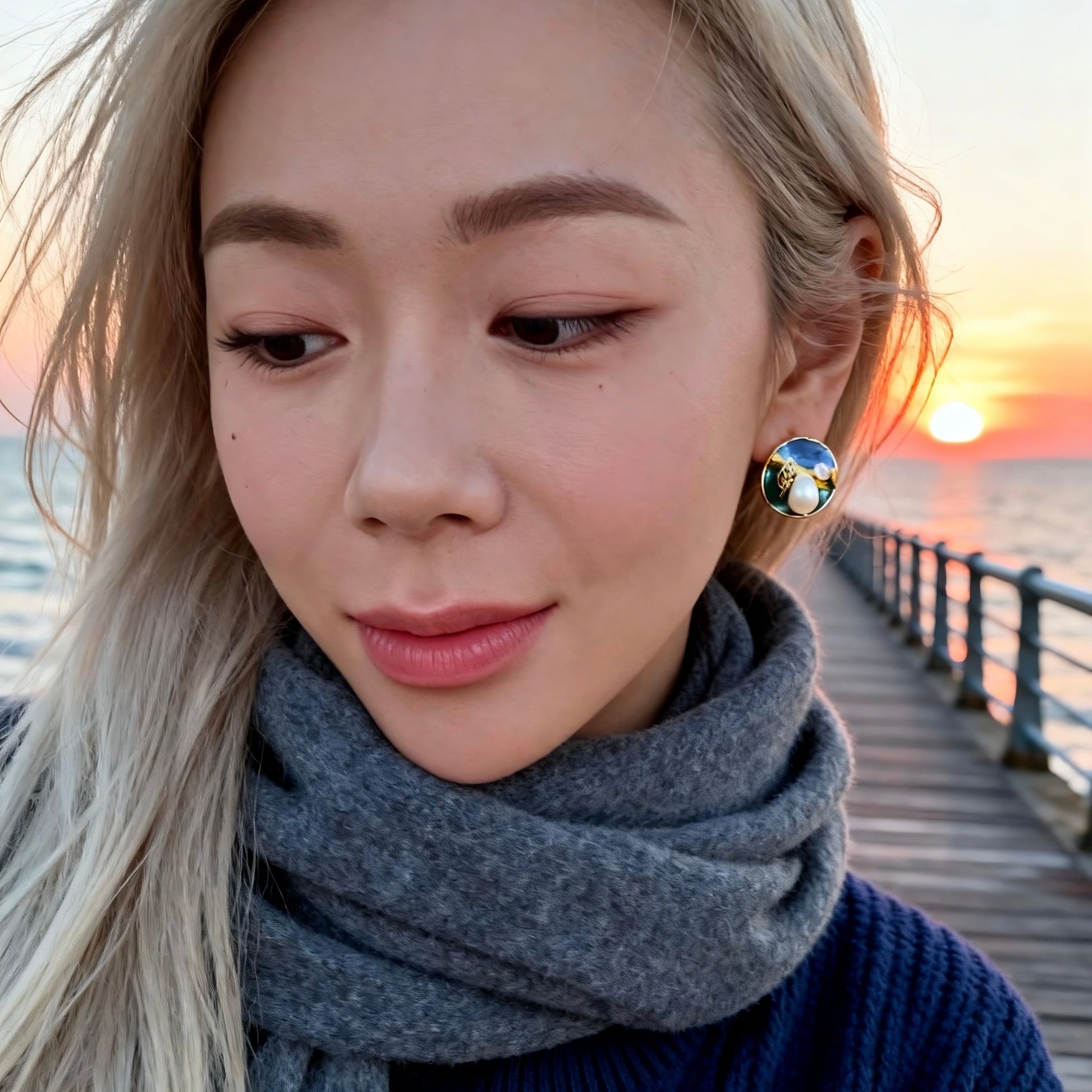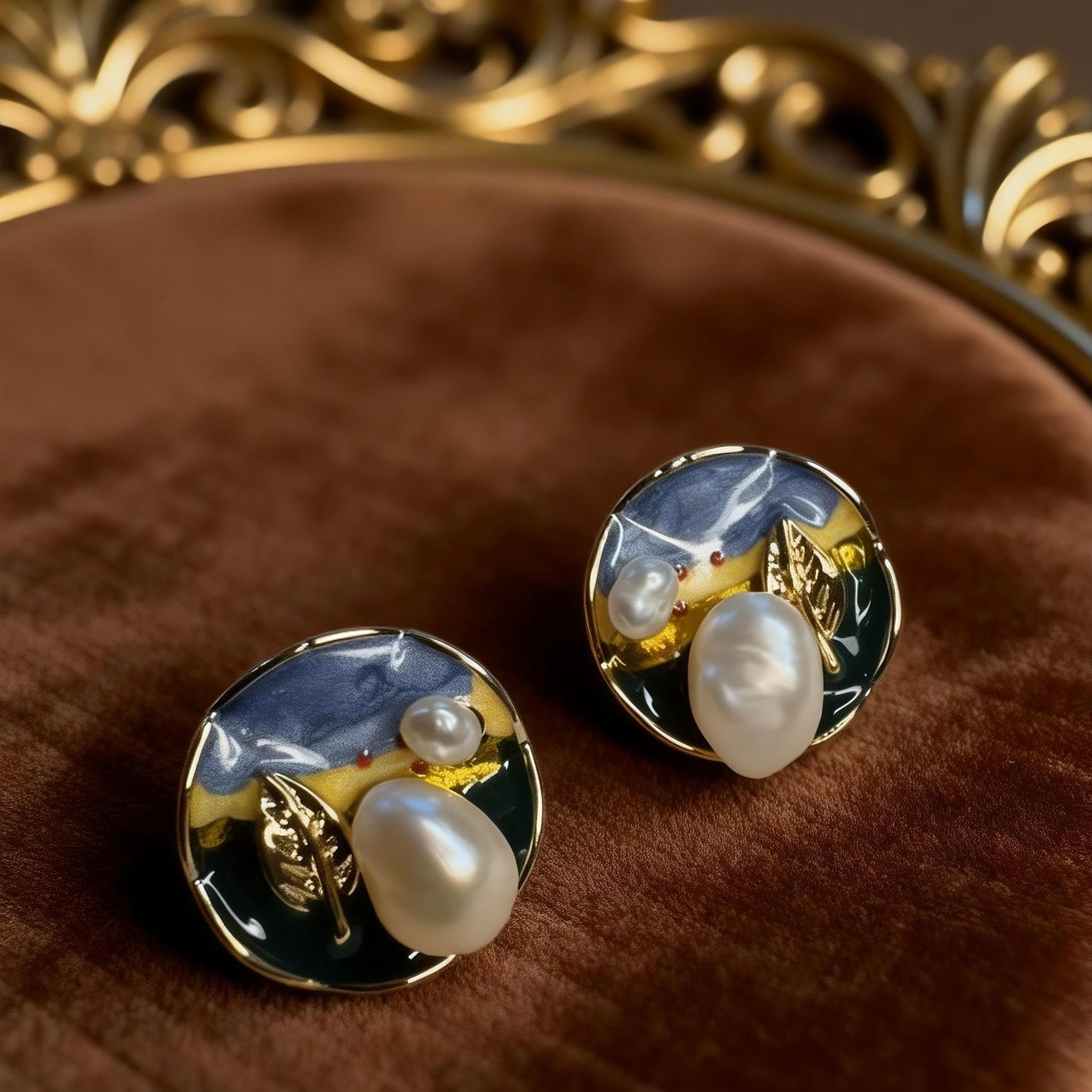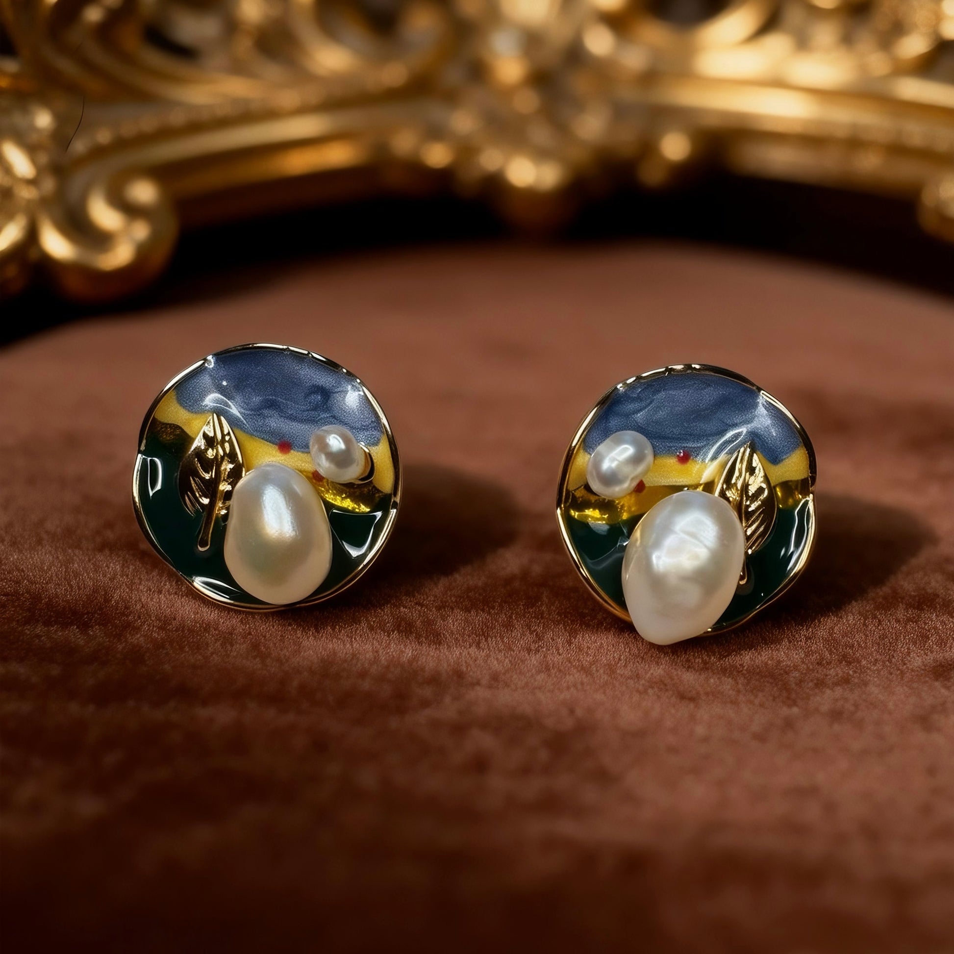 A warm blend of artisan texture and autumn colors, these statement round studs feature hand-painted swirls of navy, mustard, and forest green paired with luminous imitation pearls. Gold leaf accents add a rich, handcrafted touch—making every pair feel uniquely expressive.