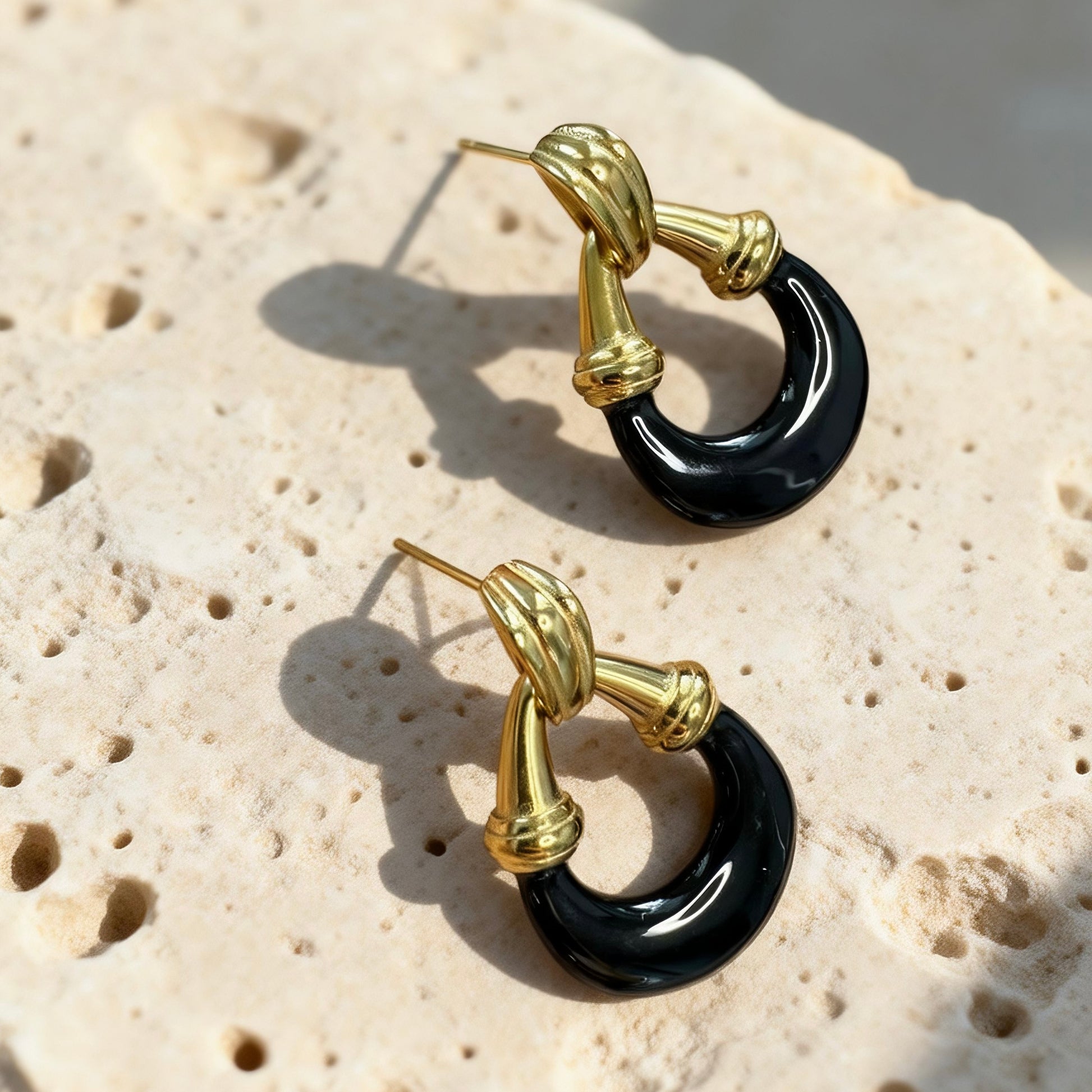 These black and gold hoop earrings feature a bold curved black form accented with structured gold detailing. The sleek silhouette creates a powerful yet refined statement.