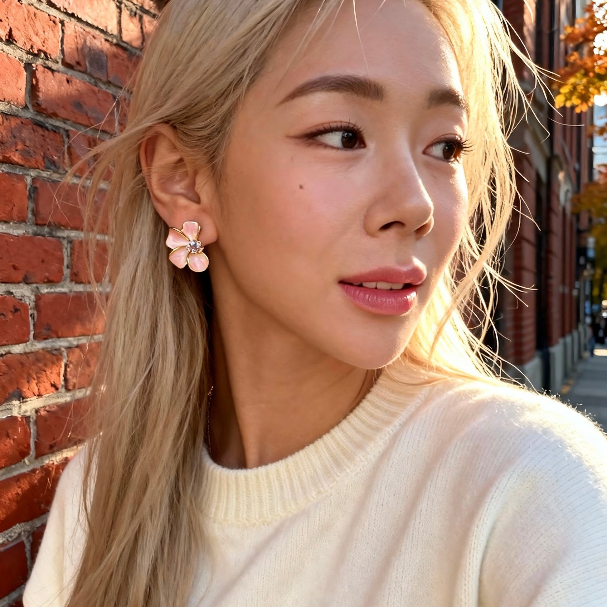Soft blush petals and delicate gold edges come together in these romantic floral stud earrings. Finished with sparkling crystal accents, the design feels feminine, graceful, and effortless—perfect for everyday wear or special moments.