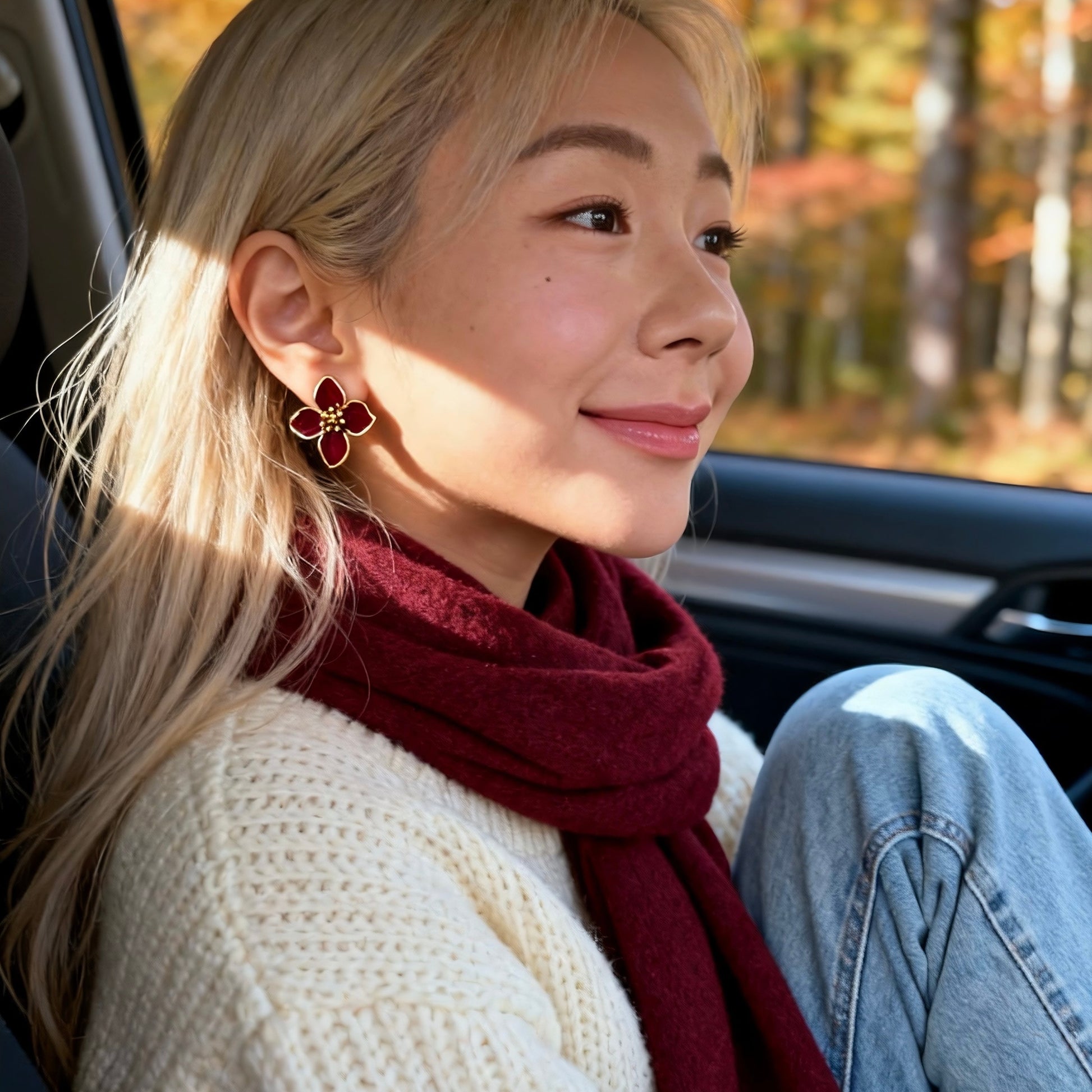 Rich burgundy enamel petals framed in gold create a bold yet elegant floral silhouette.