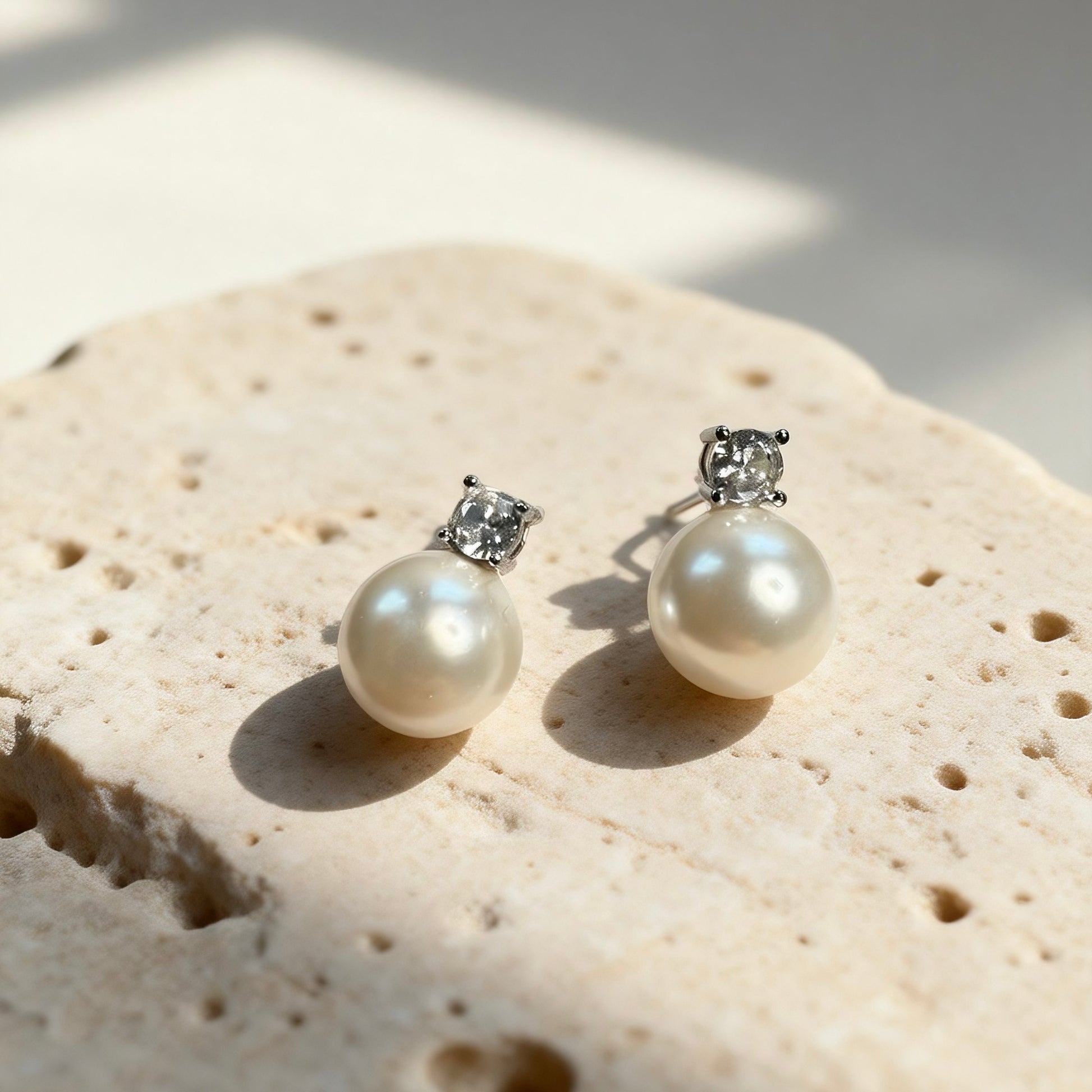 These pearl stud earrings feature a luminous round pearl topped with a delicate crystal accent, creating a refined and feminine silhouette. Minimal yet polished, they complement both everyday outfits and formal looks.