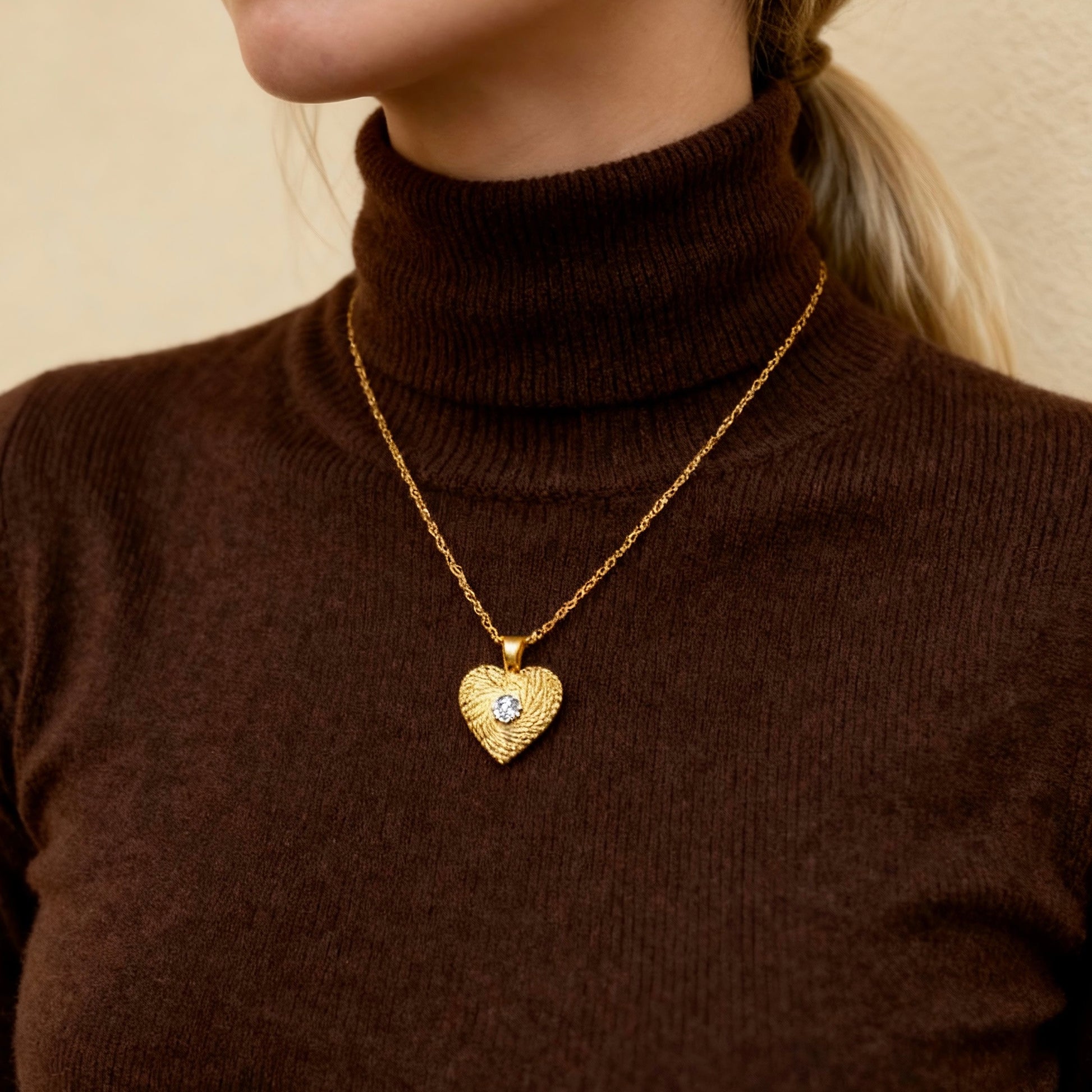 A beautifully textured heart pendant crafted inย 18K gold-plated stainless steel, finished with a sparkling cubic zirconia centerpiece.