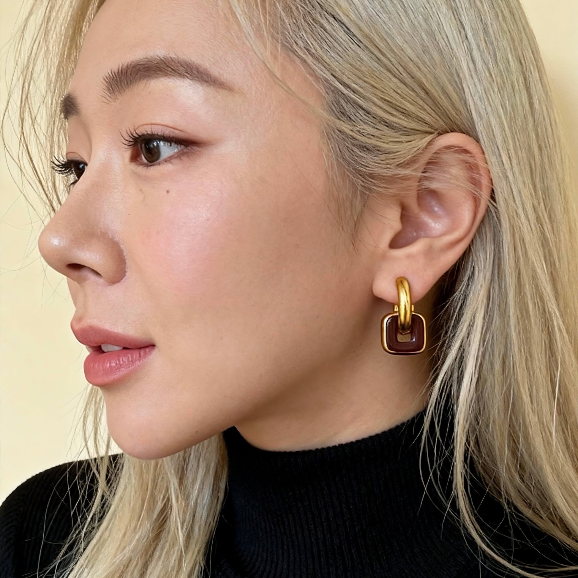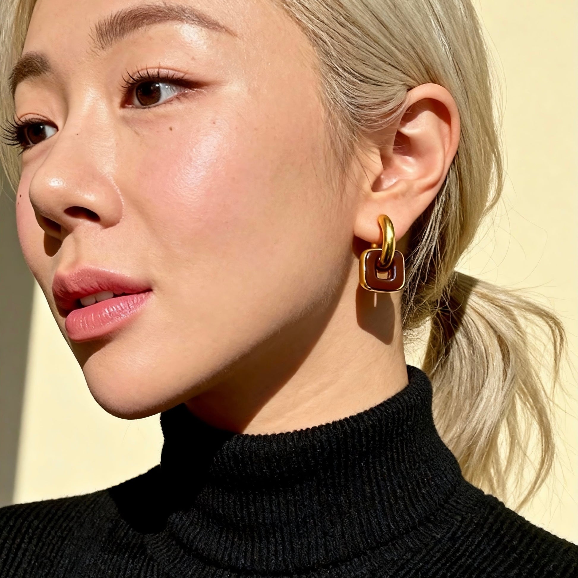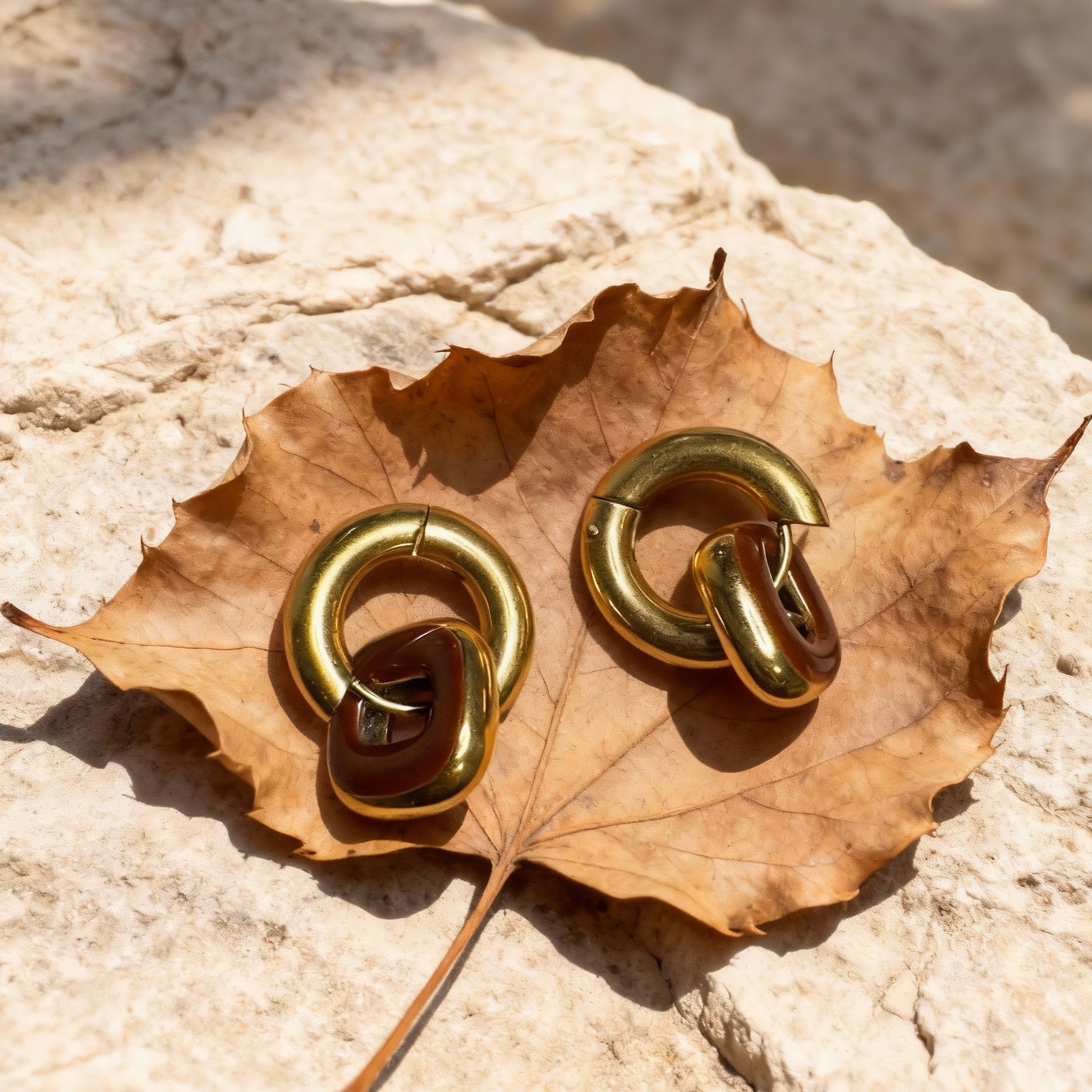 Modern linked hoop earrings featuring a bold gold-and-red brown contrast.