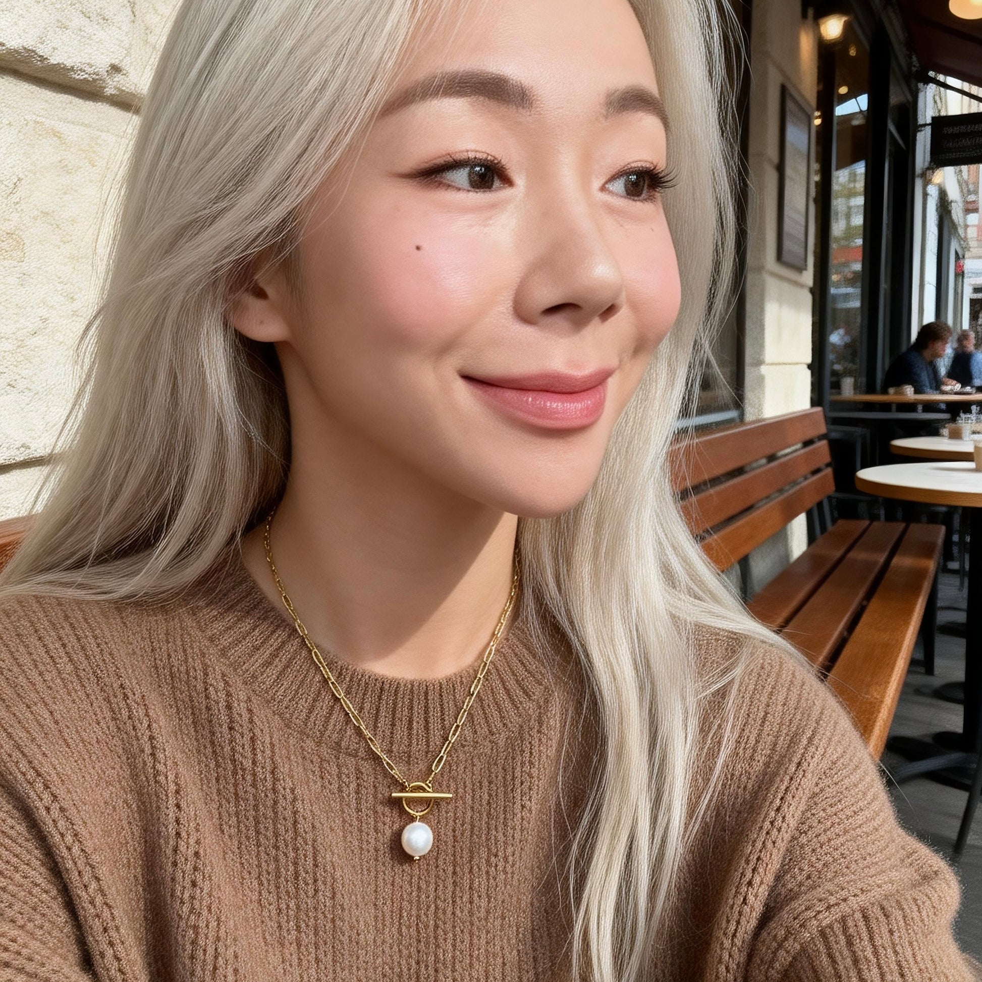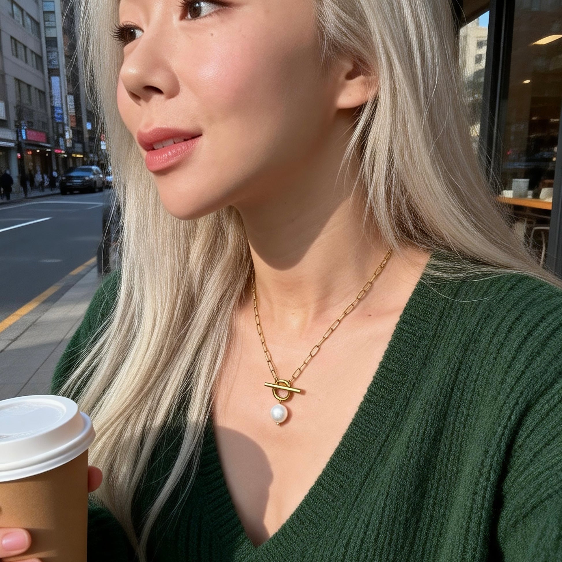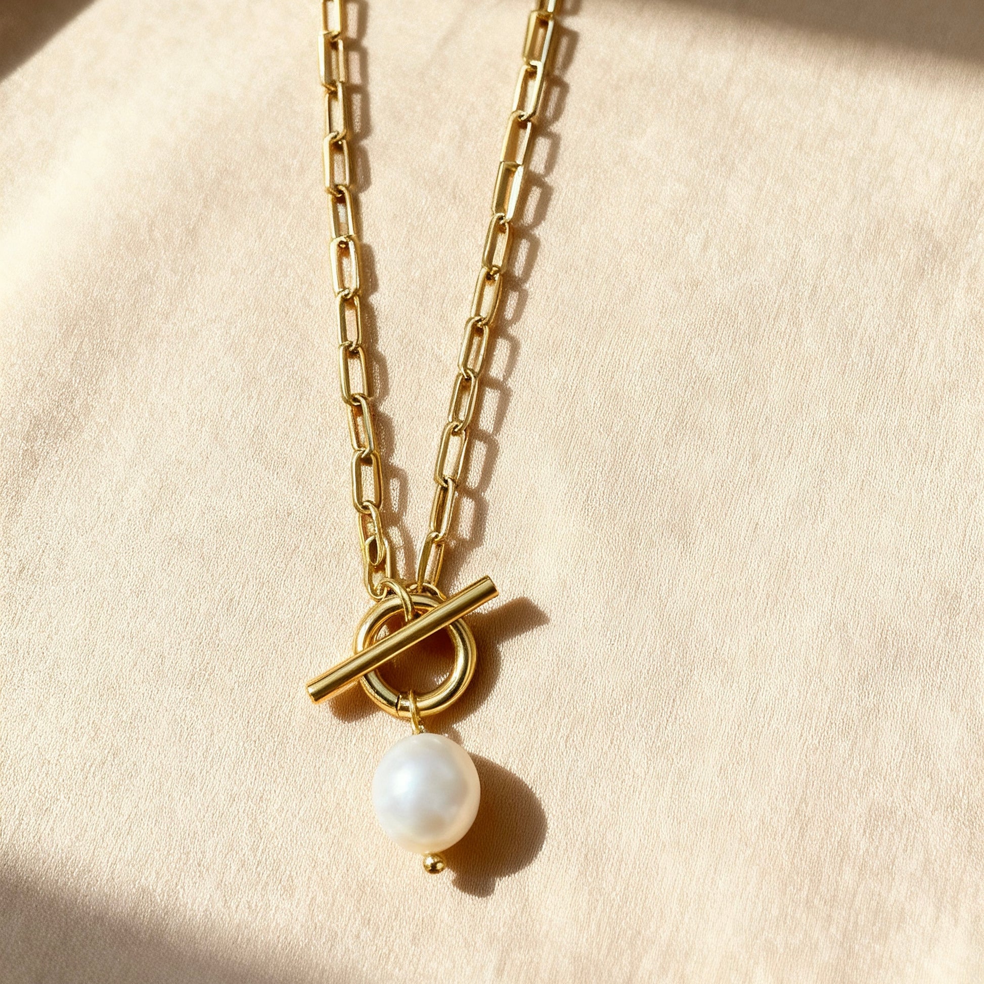 A chic toggle-style necklace featuring a lustrous pearl drop on a gold-plated stainless steel chain.