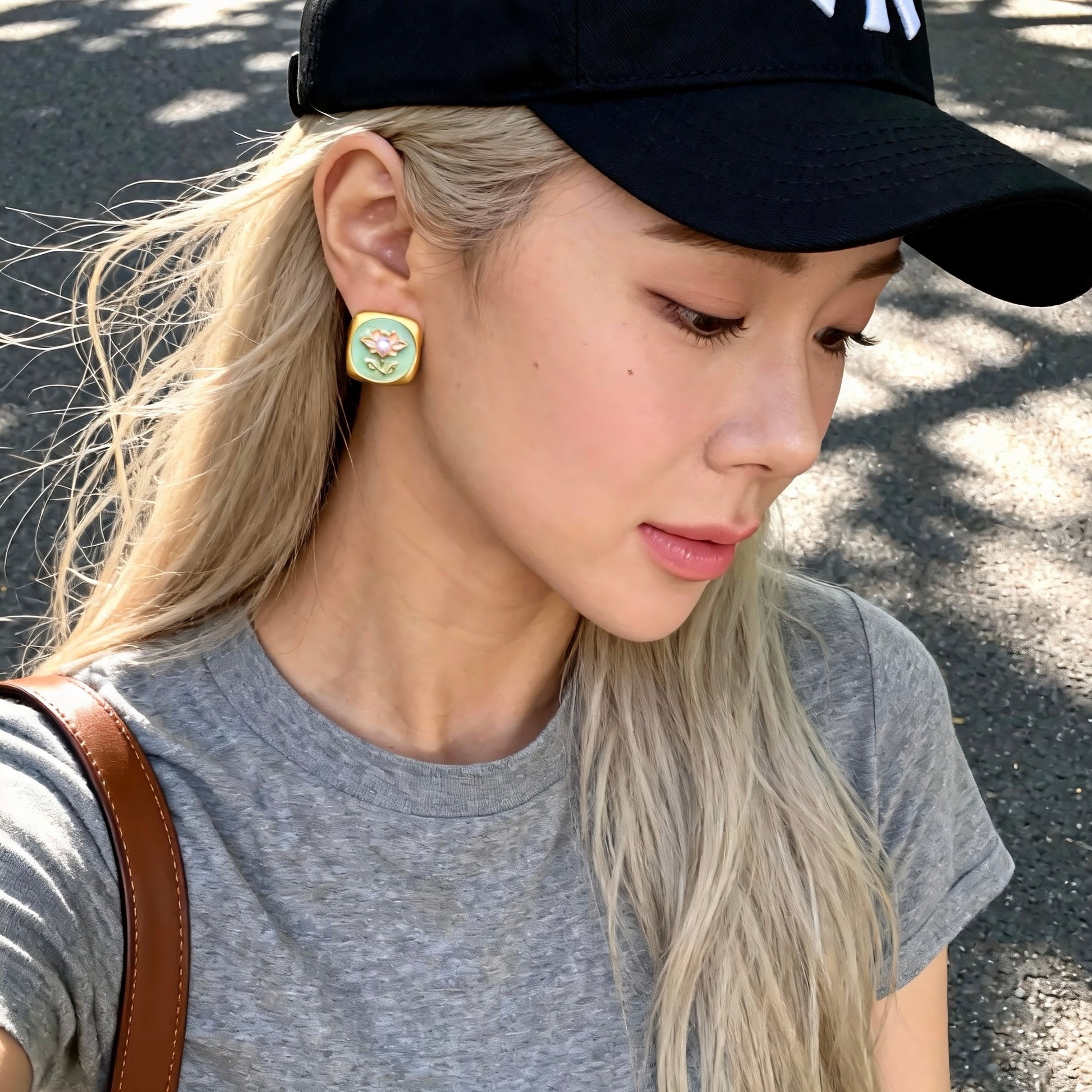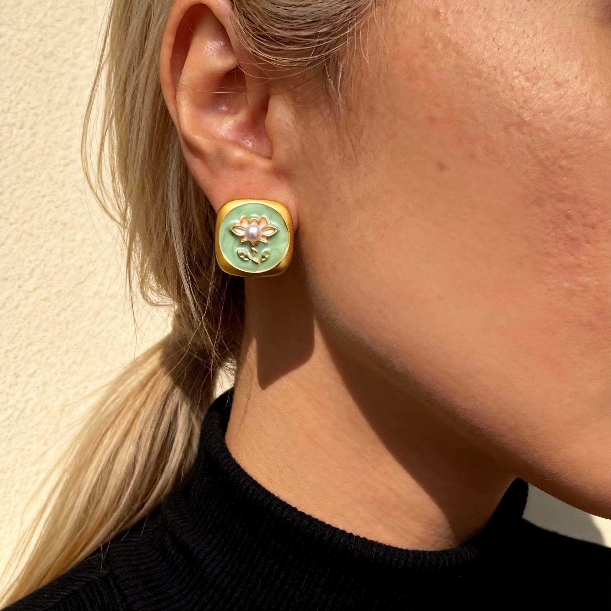 Soft jade green meets a delicate pearl blossom—these vintage-inspired square studs bring an elegant, serene charm to your everyday style. The matte gold frame adds a warm, antique glow, making the earrings look refined yet uniquely artistic.