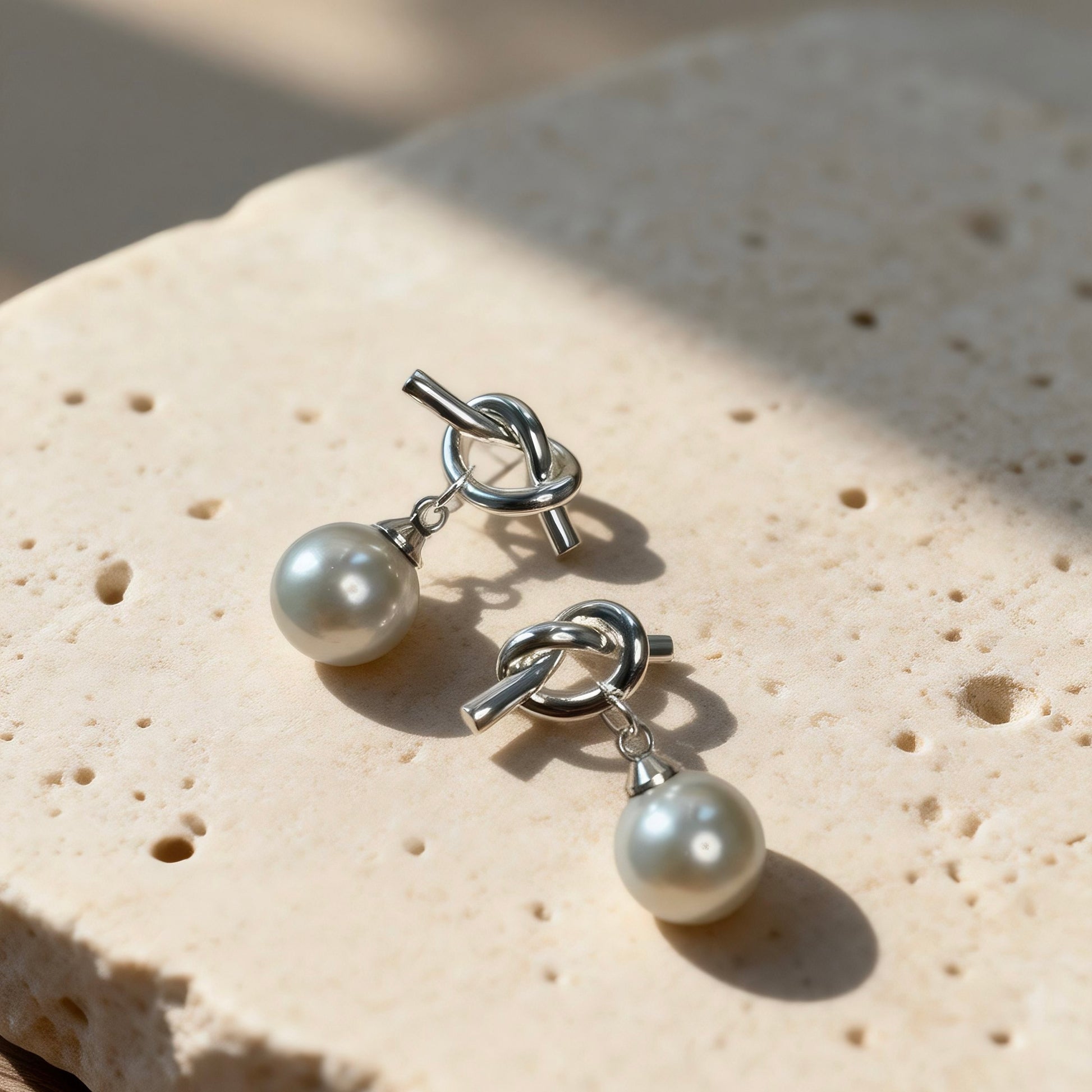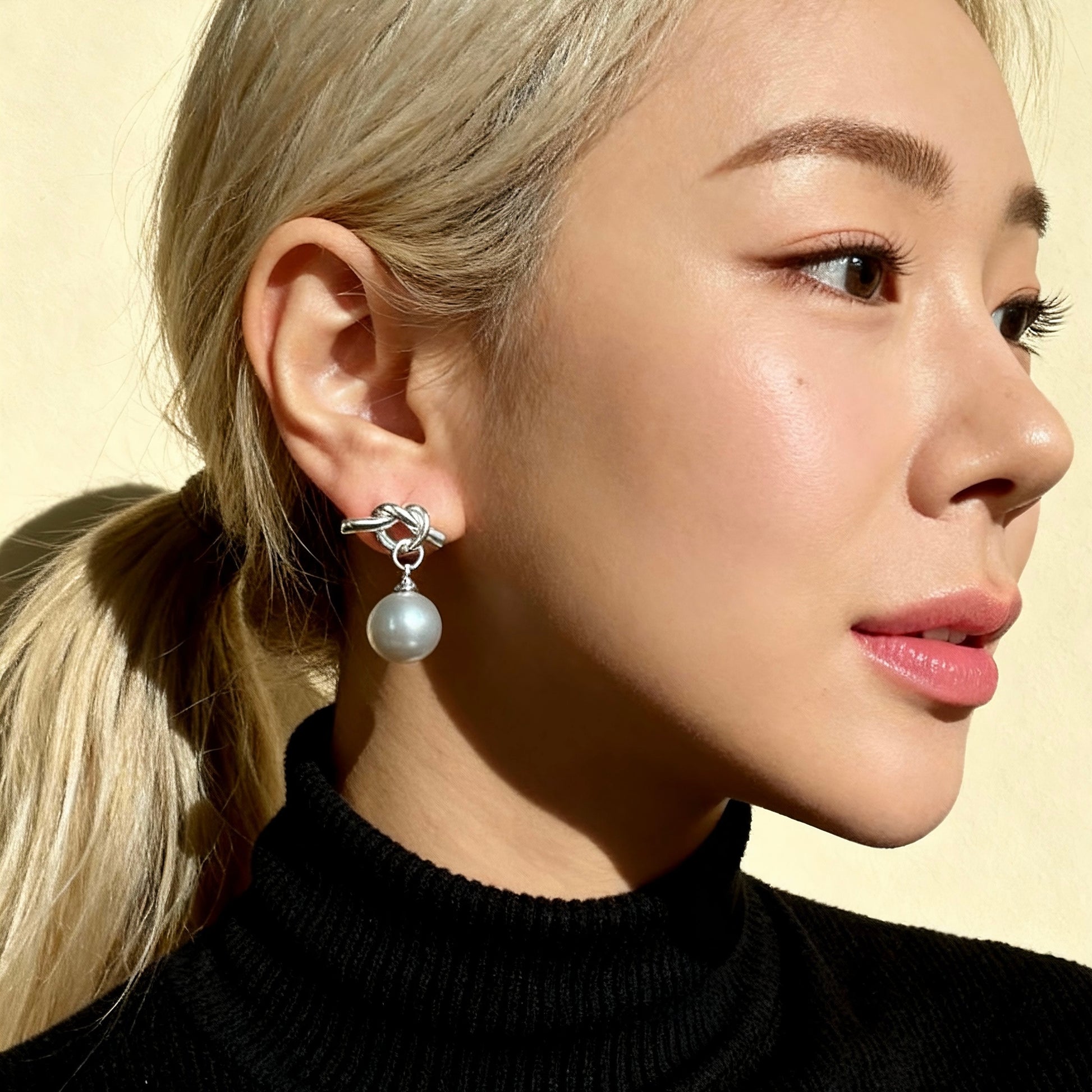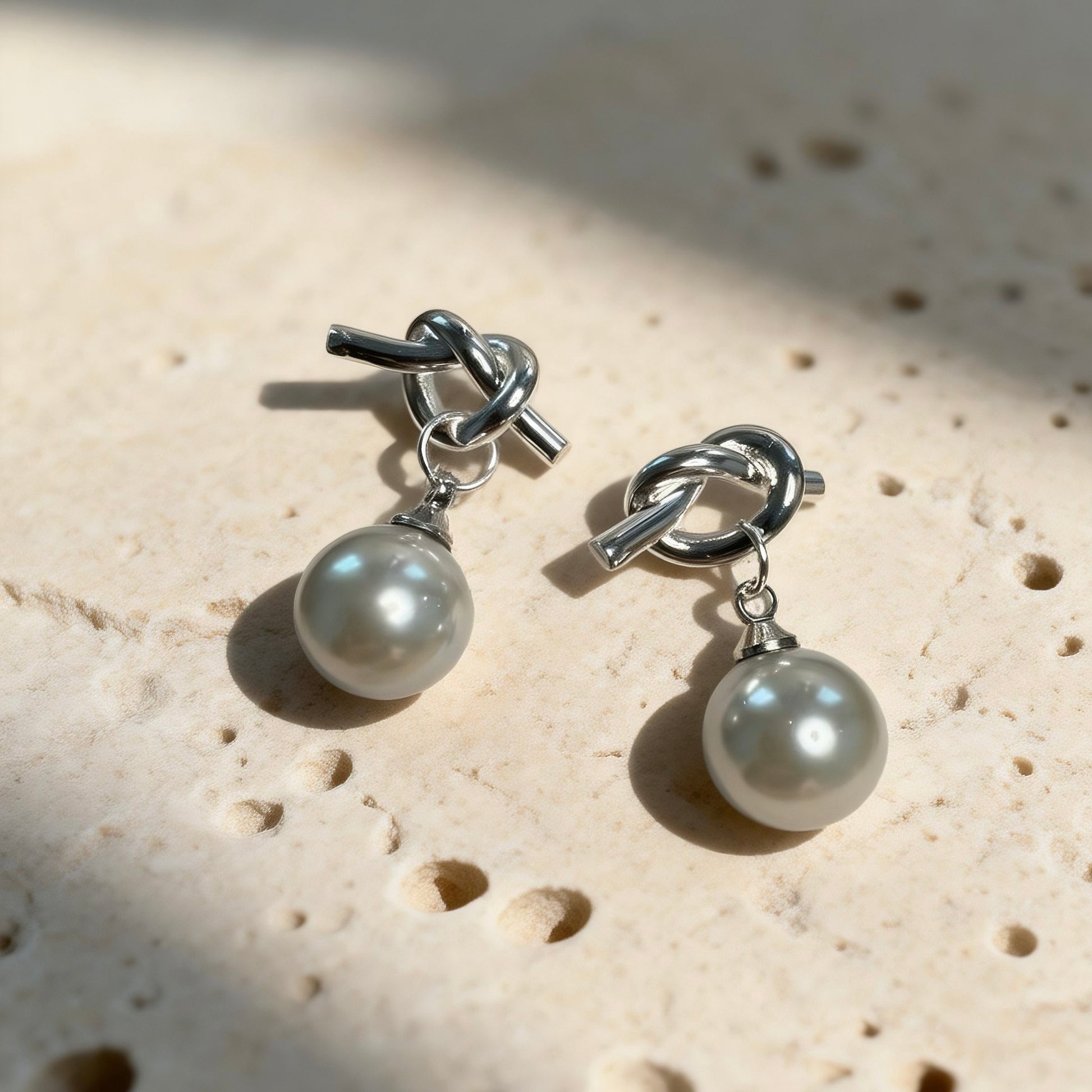 These grey pearl knot earrings feature a polished silver knot paired with a soft smoky-grey pearl drop. The sculptural knot detail adds structure, while the grey pearl brings subtle sophistication and cool-toned elegance.
