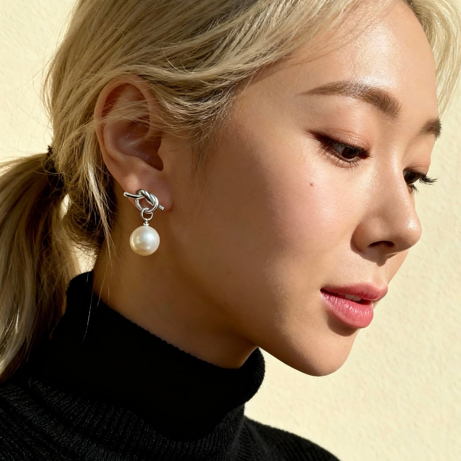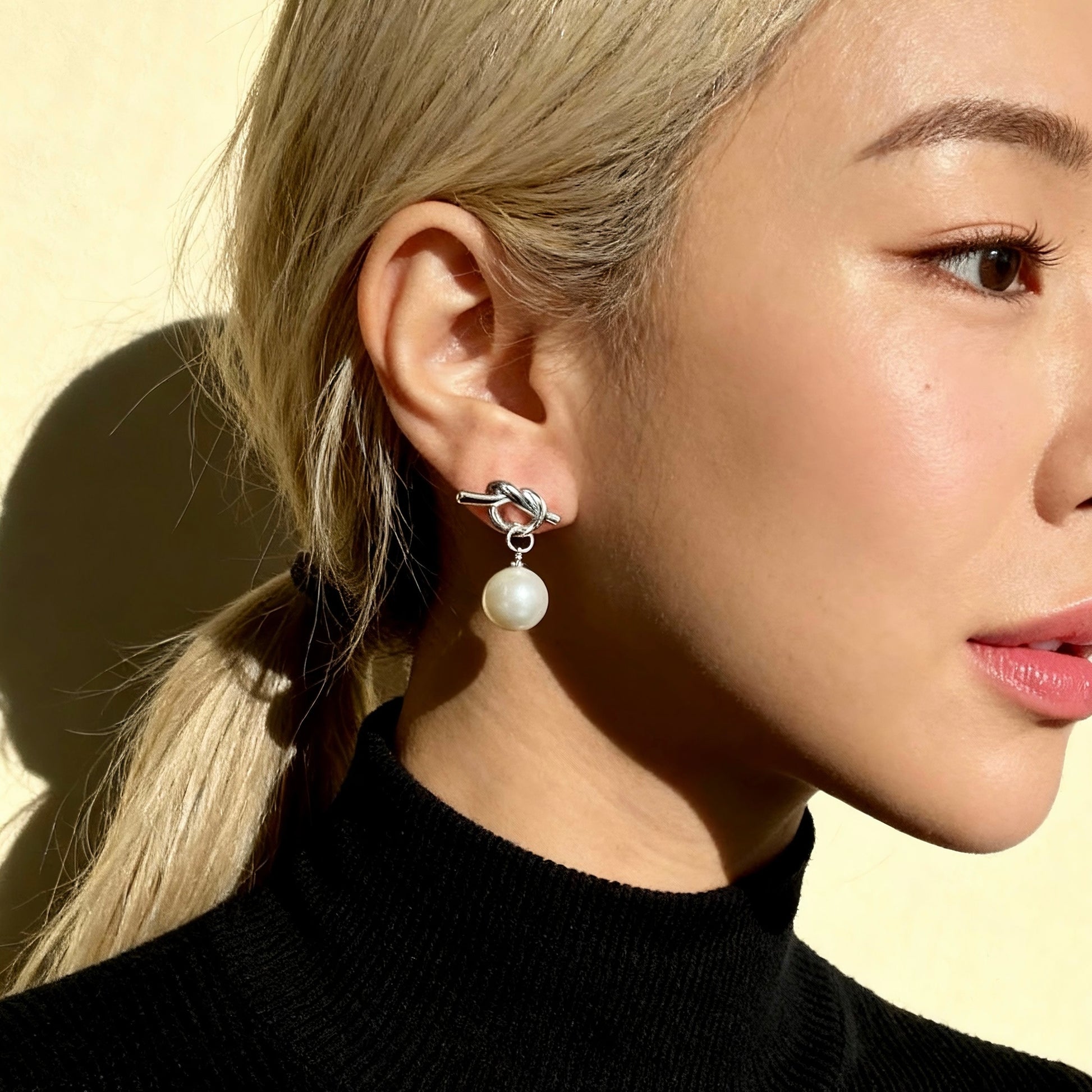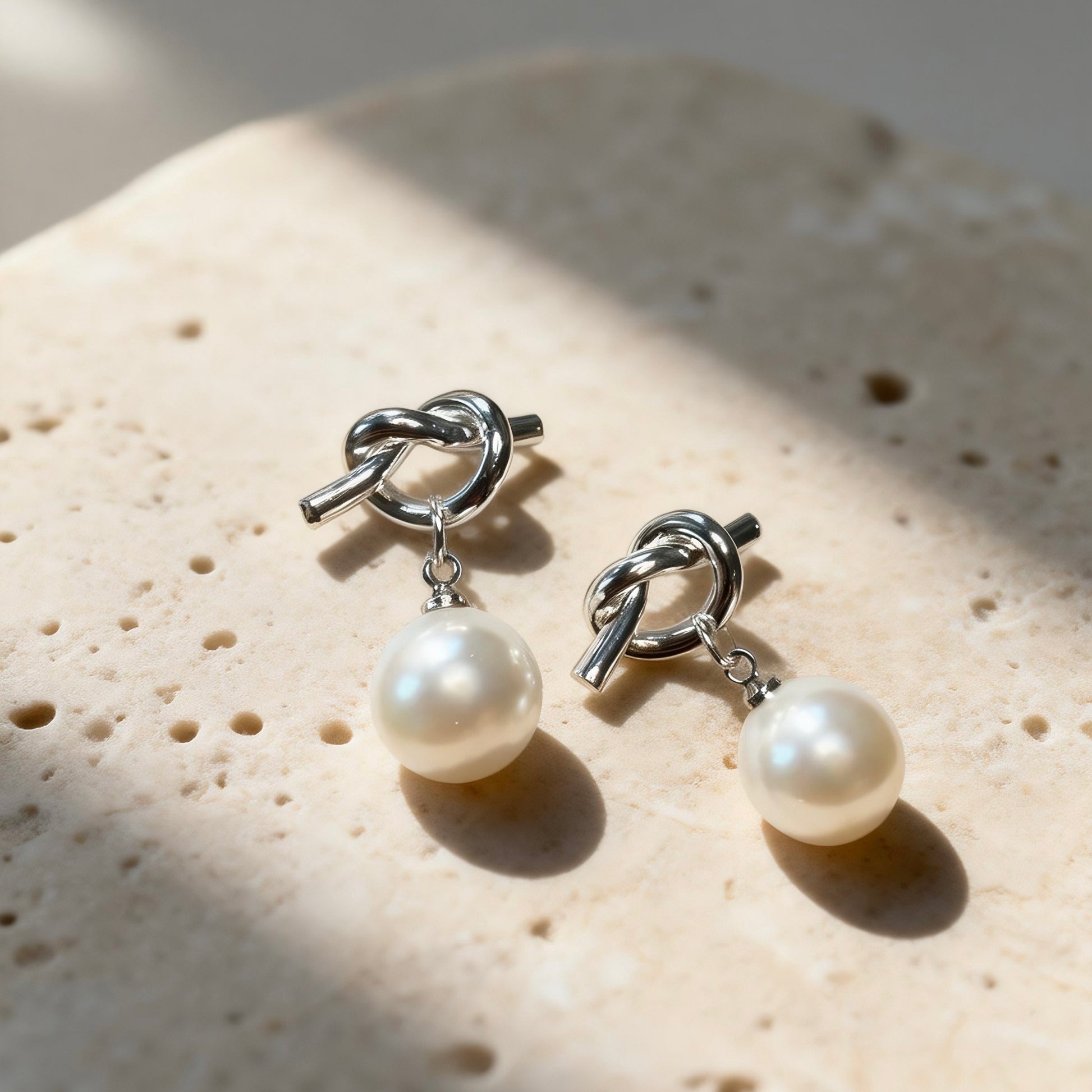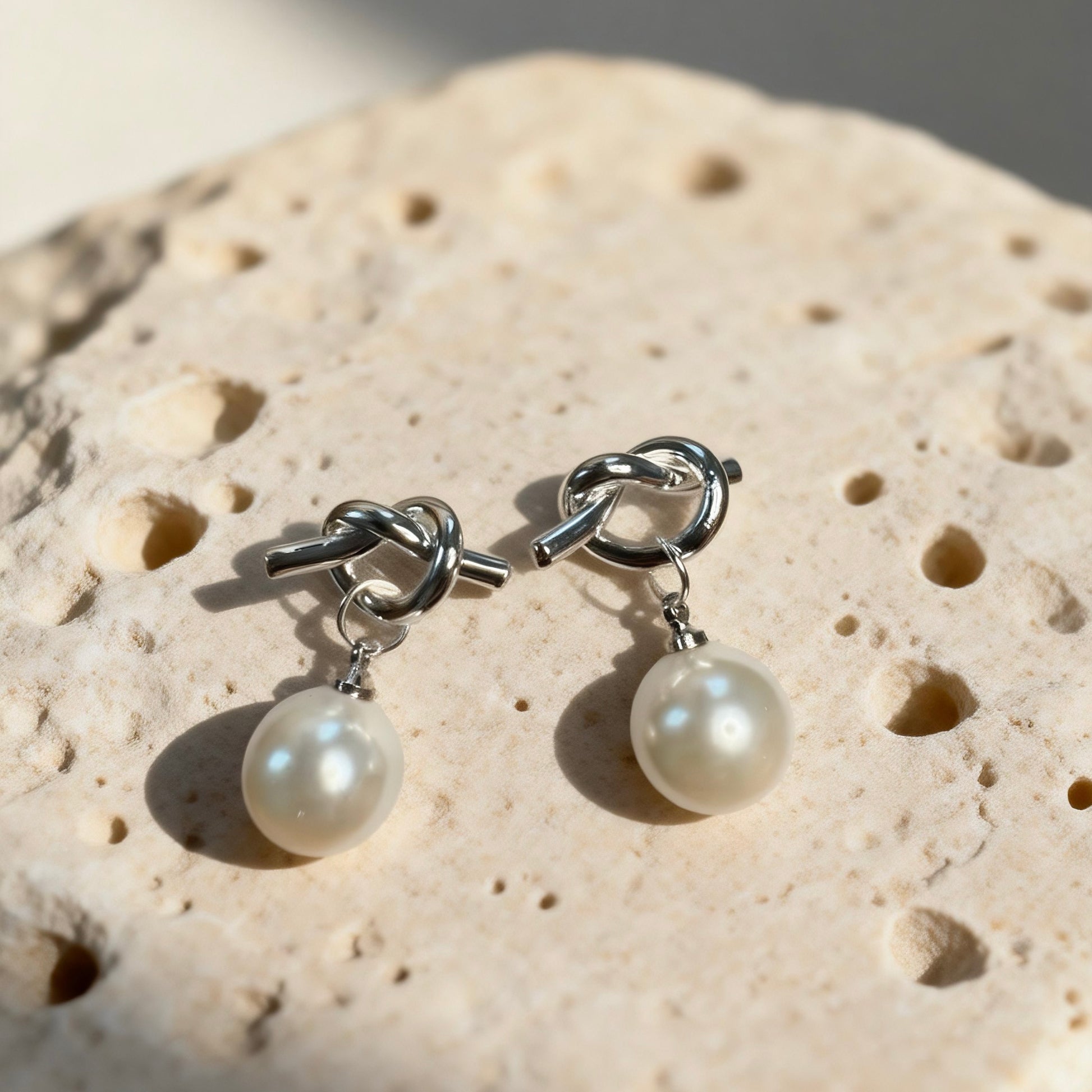These knot pearl drop earrings feature a polished silver knot design paired with a luminous pearl drop. The sculptural knot symbolizes connection and strength, while the pearl adds softness and elegance.
