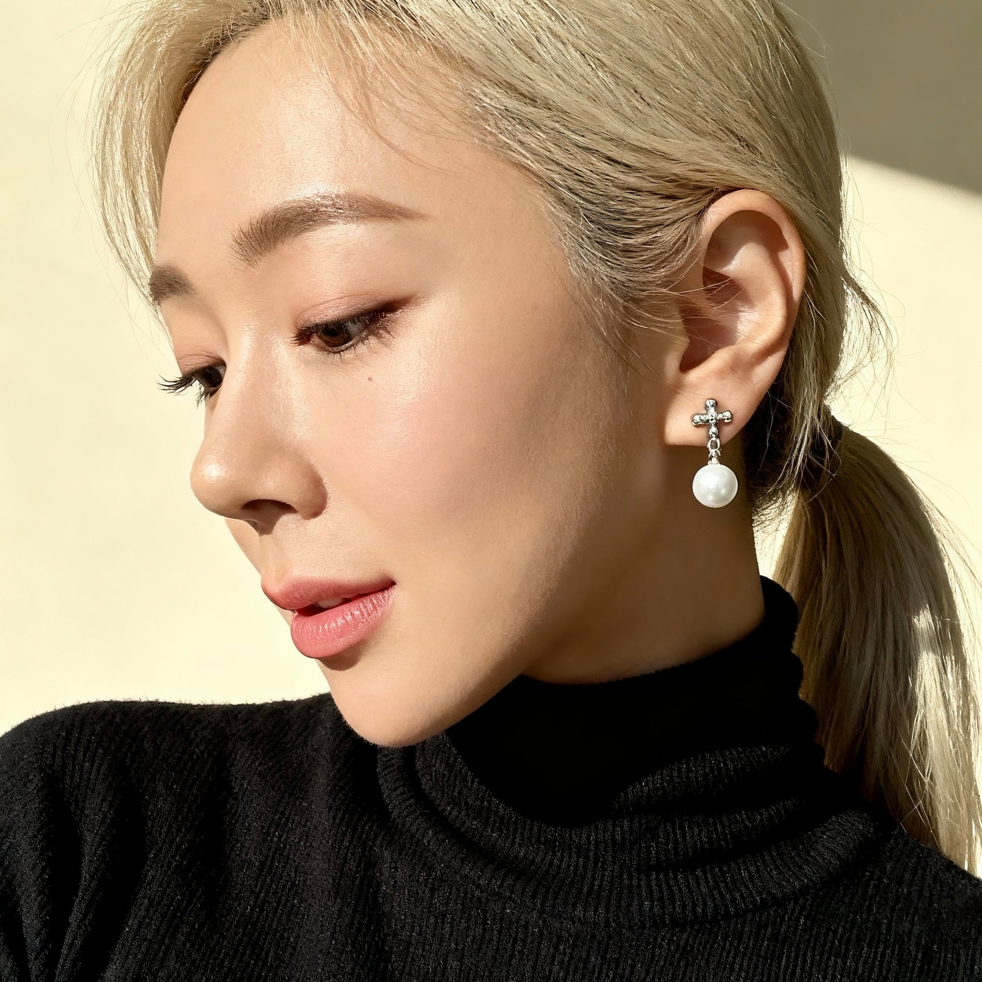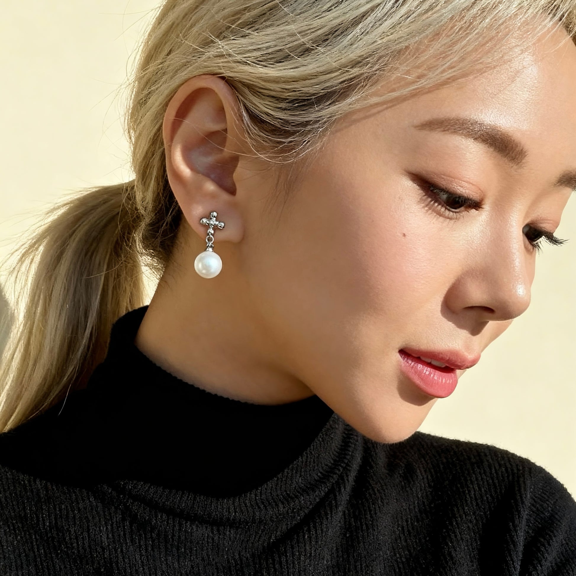 These silver-tone pearl drop studs blend clean geometric design with classic elegance. The polished sphere cross detail adds a modern architectural touch, while the luminous pearl creates soft movement and sophistication.
