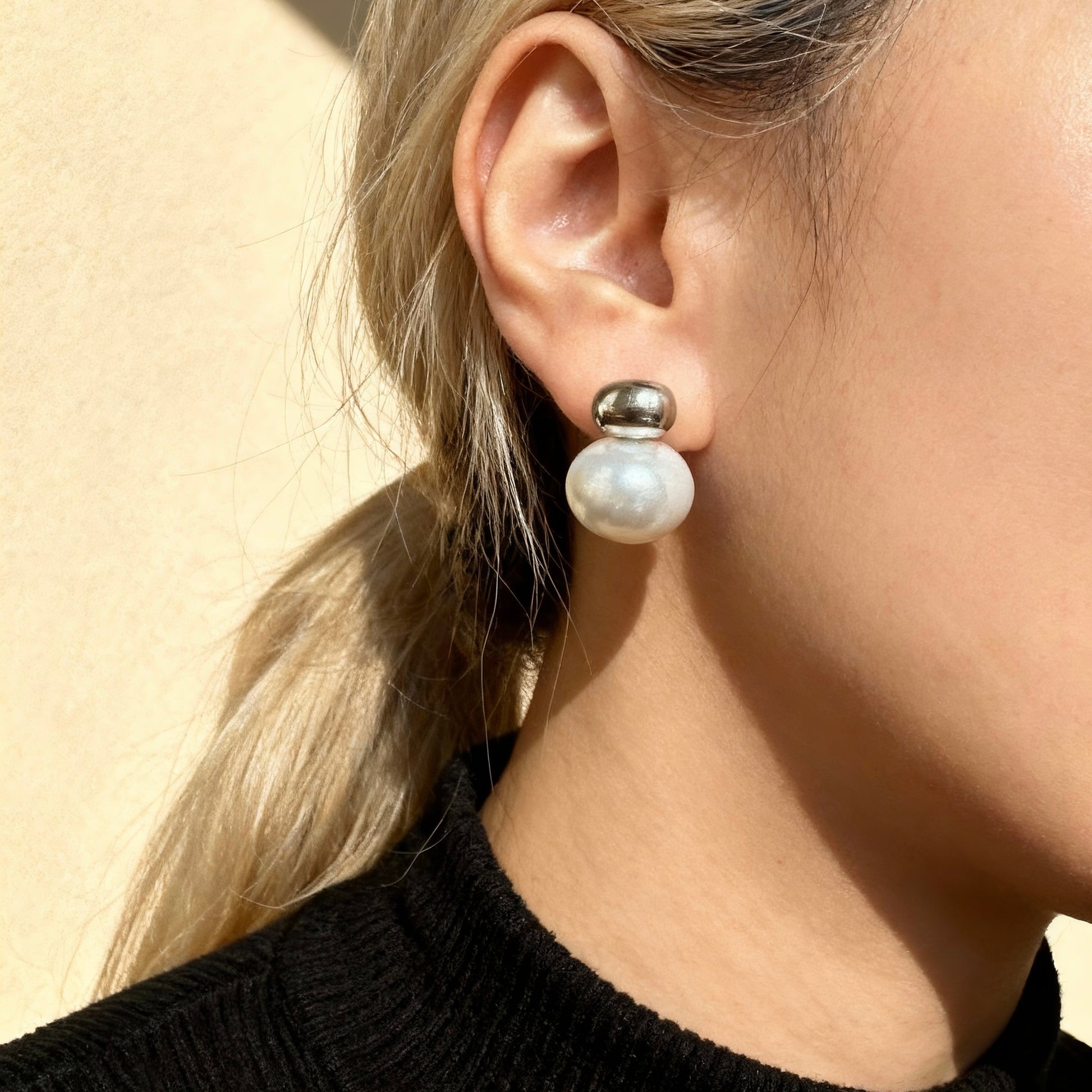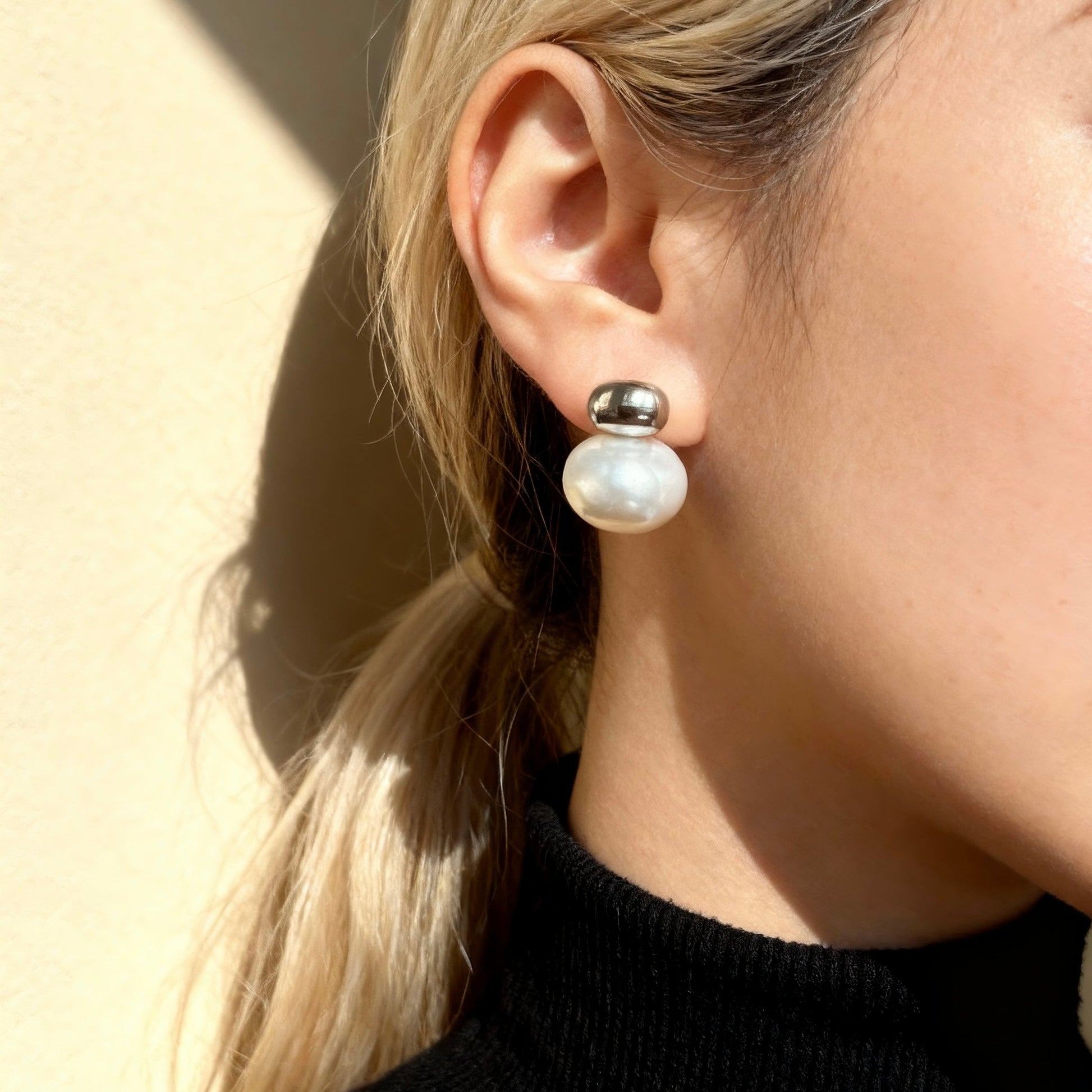 These silver pearl stud earrings feature a polished organic top paired with a luminous rounded pearl. The contrast between cool silver and soft pearl creates a refined, contemporary silhouette.