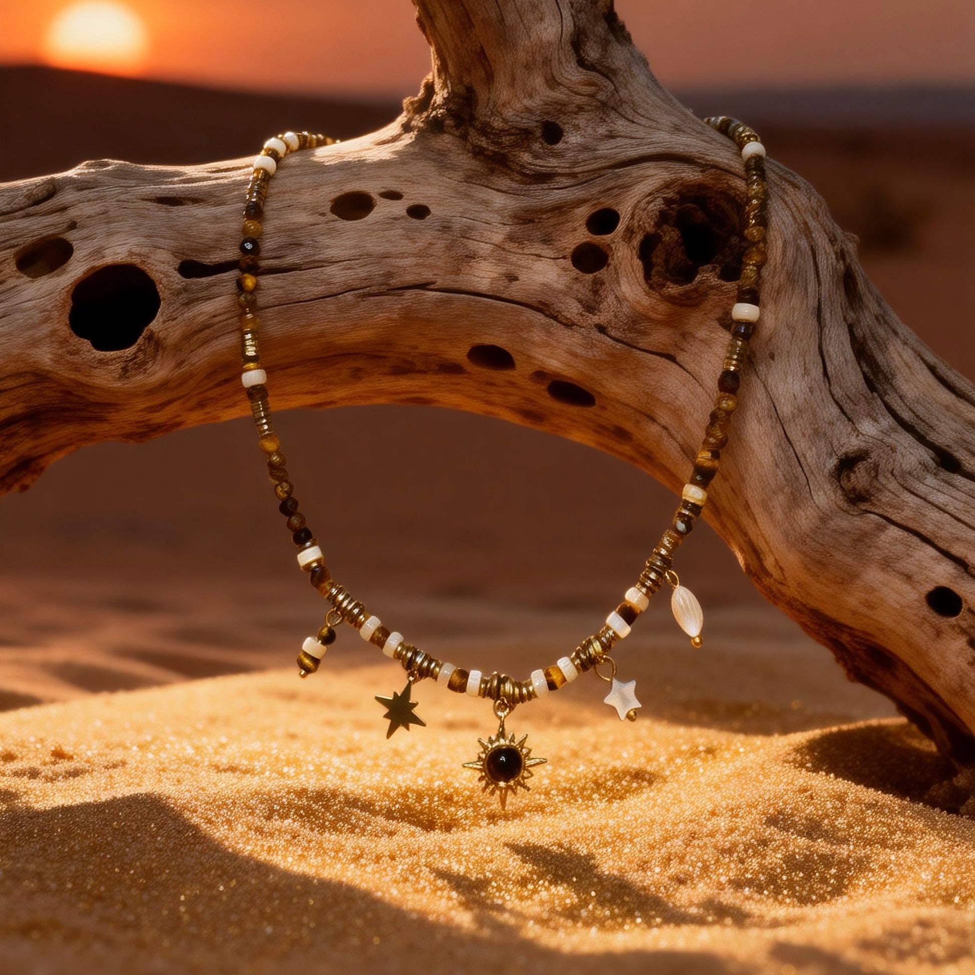 Embrace warm sunset energy with this desert-inspired beaded necklace.