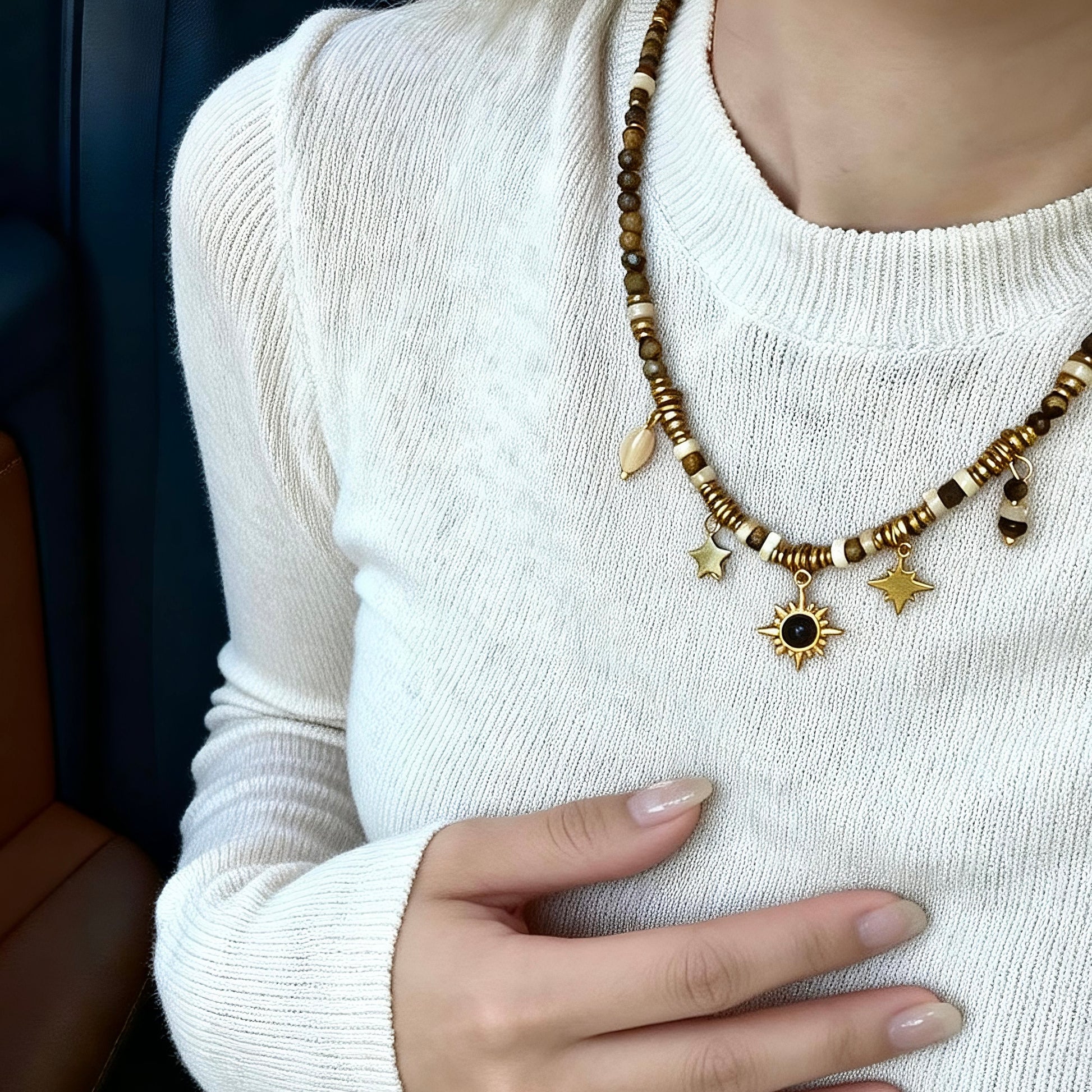 Featuring mixed natural stones, gold accents, and a radiant sun charm, this piece adds effortless boho elegance to any look. Lightweight, comfortable, and perfect for daily layering or vacation styling.