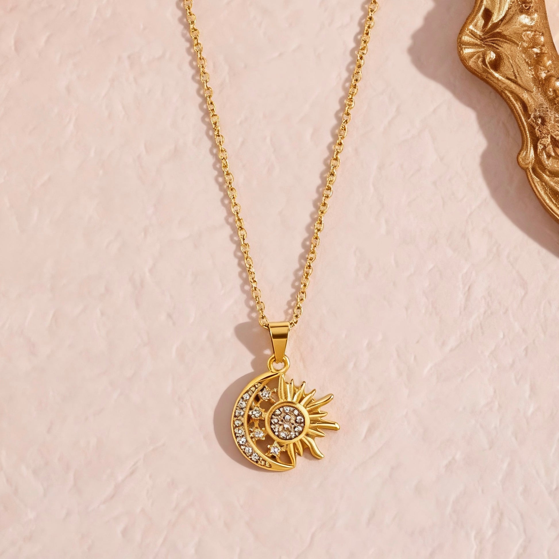 A shimmering sun & moon pendant crafted in 18K gold plated stainless steel, set with sparkling crystals for a celestial glow. Waterproof, sweat-proof, and tarnish-free—perfect for everyday wear.