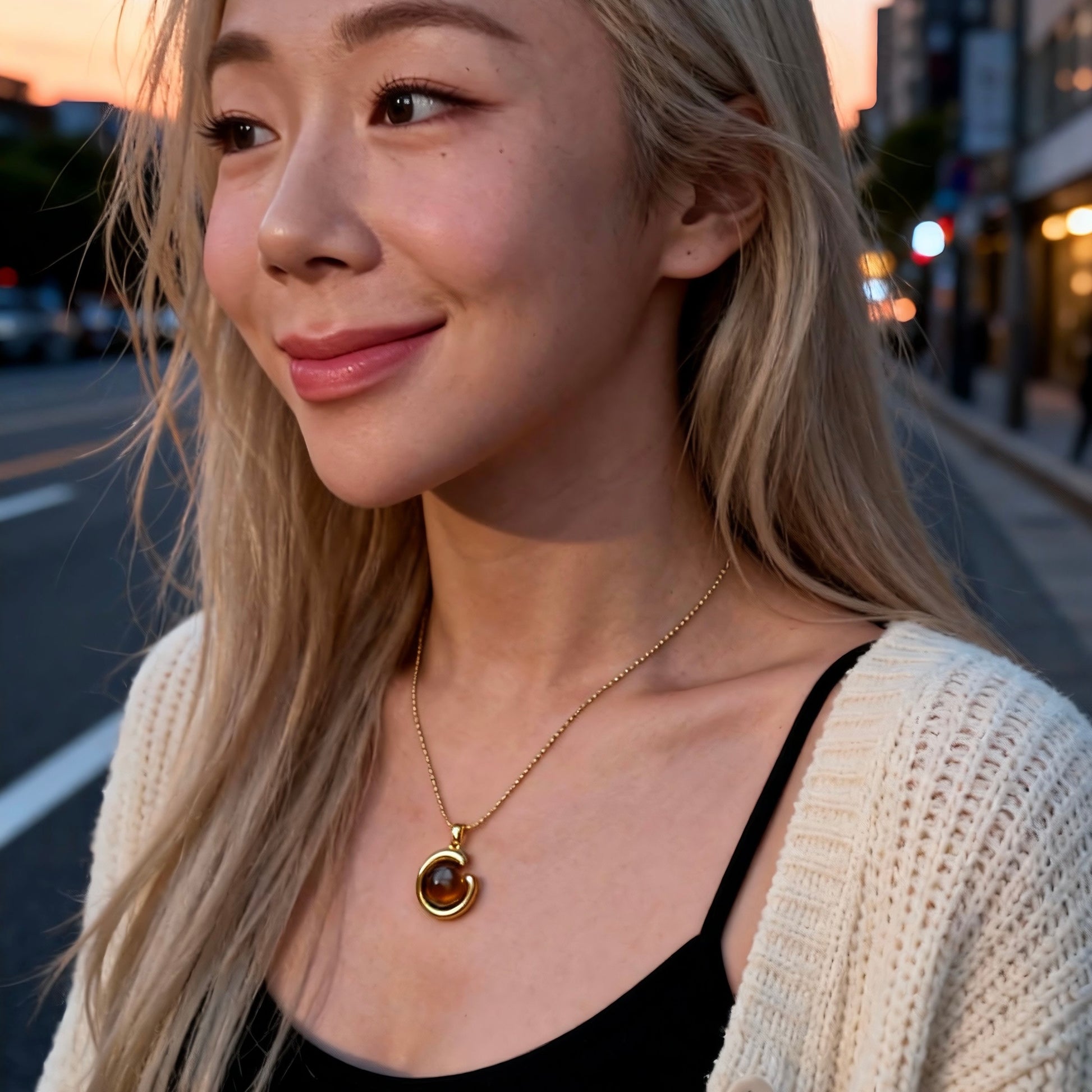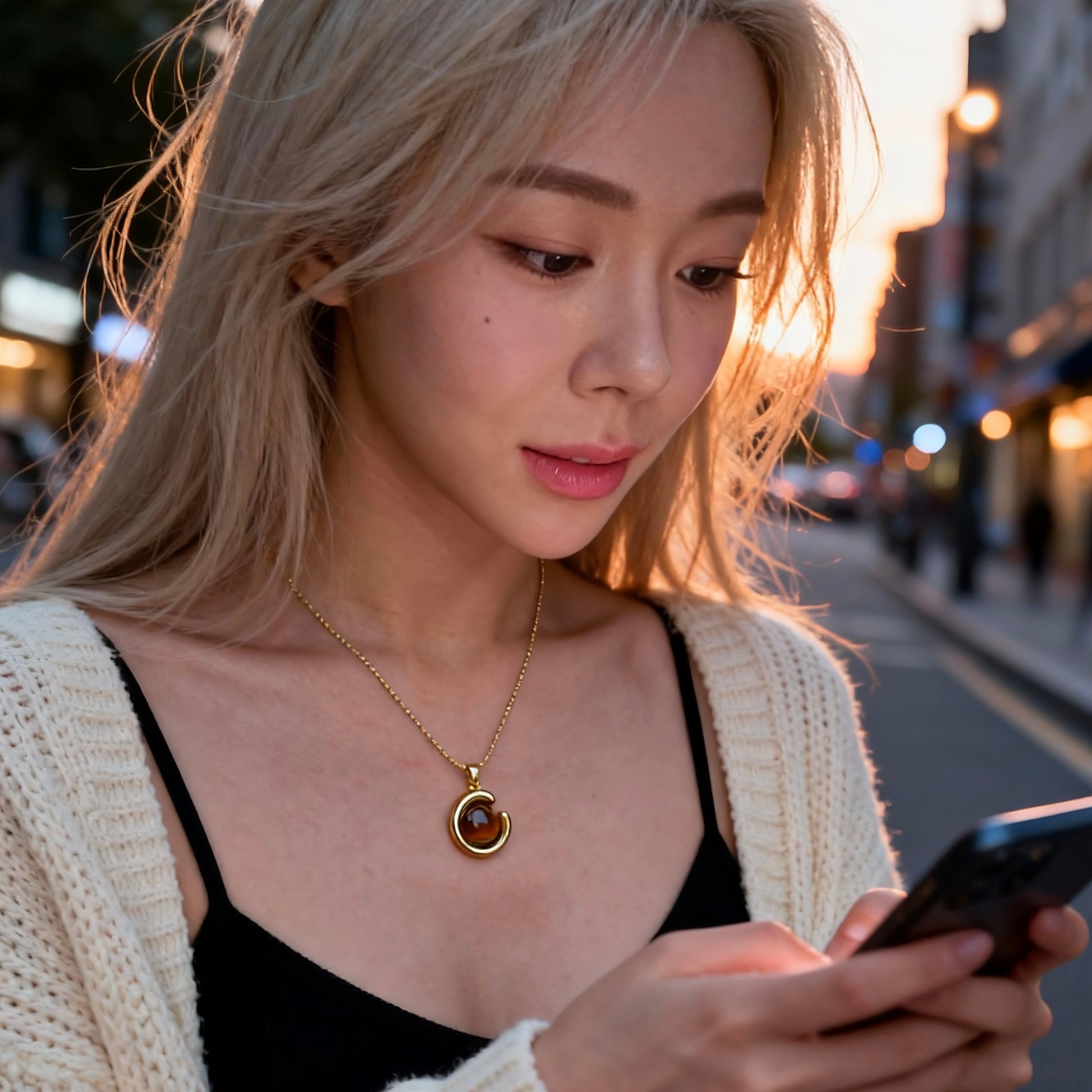 A unique C-shaped pendant wrapped around a glowing tiger eye stone, this vintage-inspired necklace brings grounding energy and effortless elegance to your everyday style.