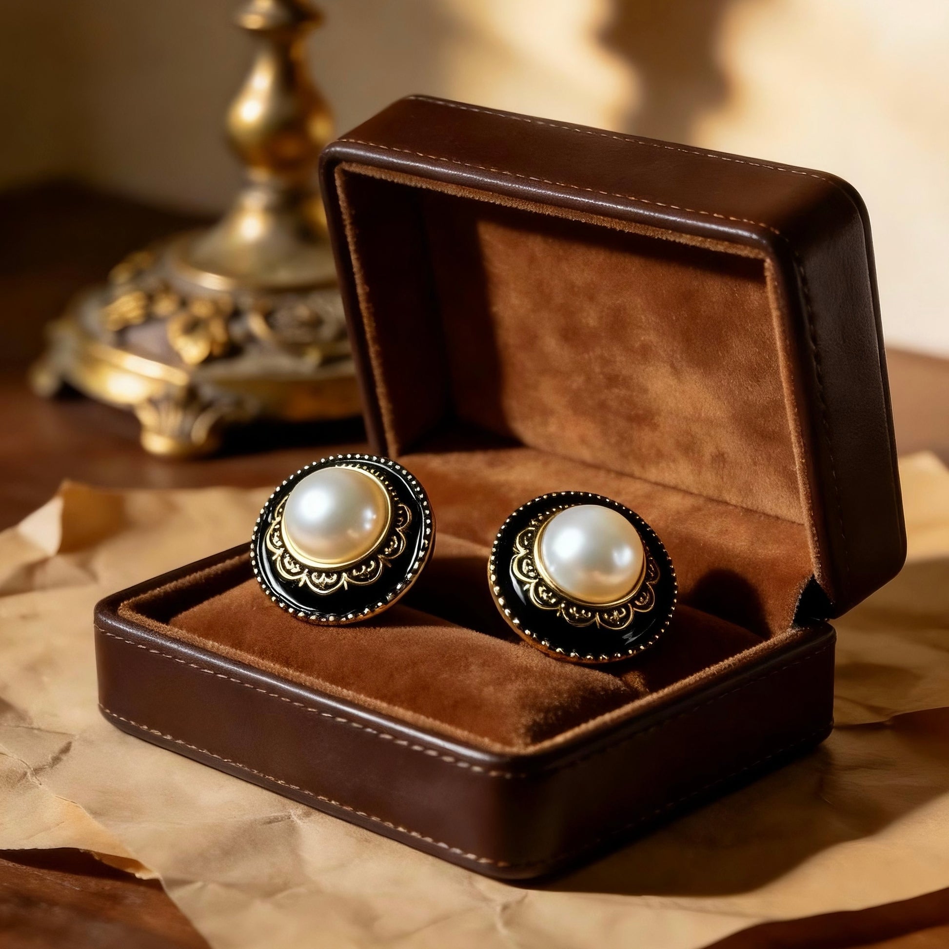 Featuring a luminous pearl framed by glossy black enamel and vintage gold detailing, these studs add an instant touch of elegance and confidence to any outfit.