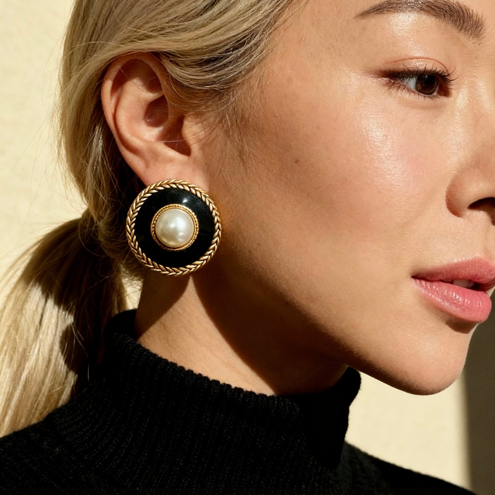 These black and gold pearl stud earrings feature a glossy black base framed with textured gold detailing, centered with a luminous pearl. The bold circular silhouette creates a refined vintage statement.