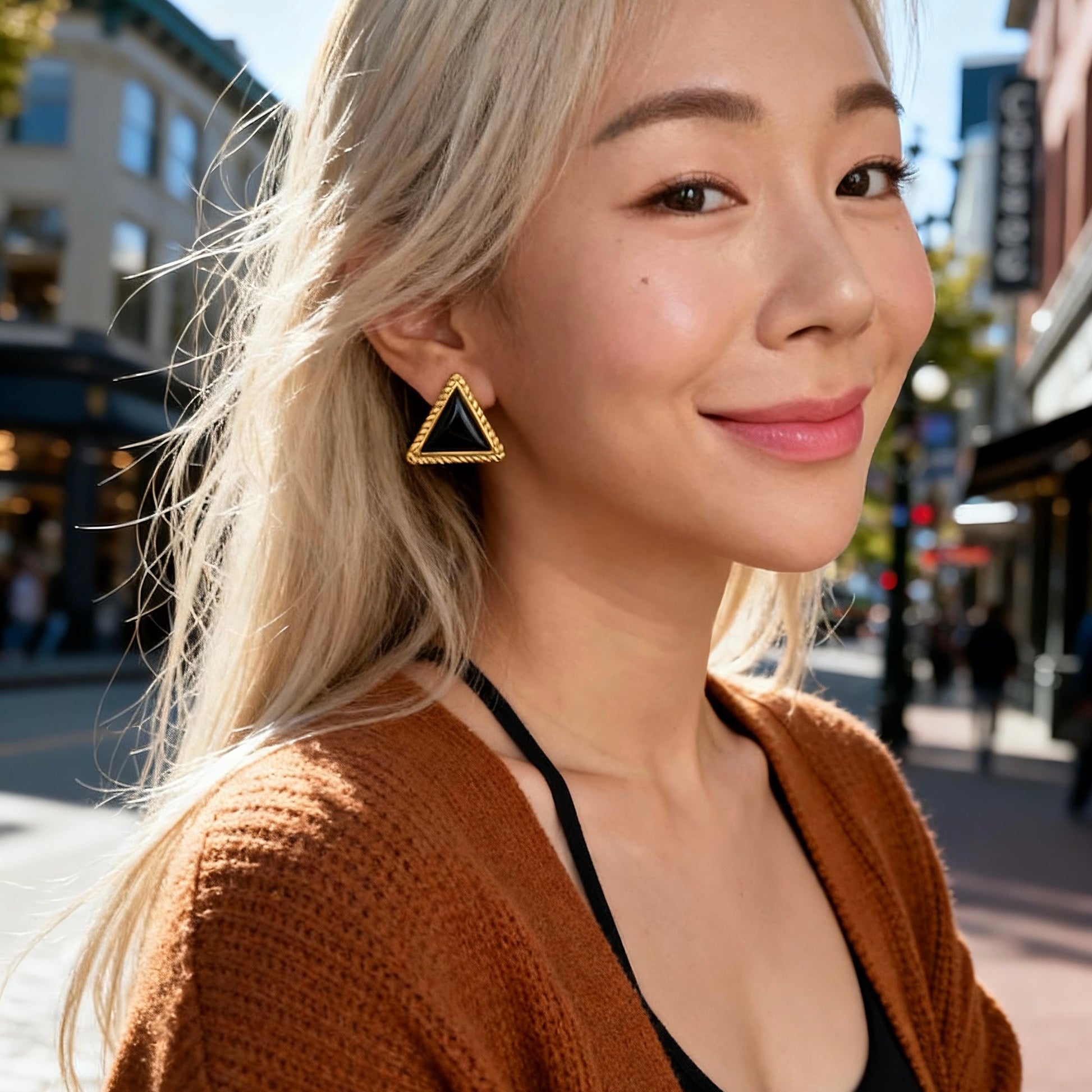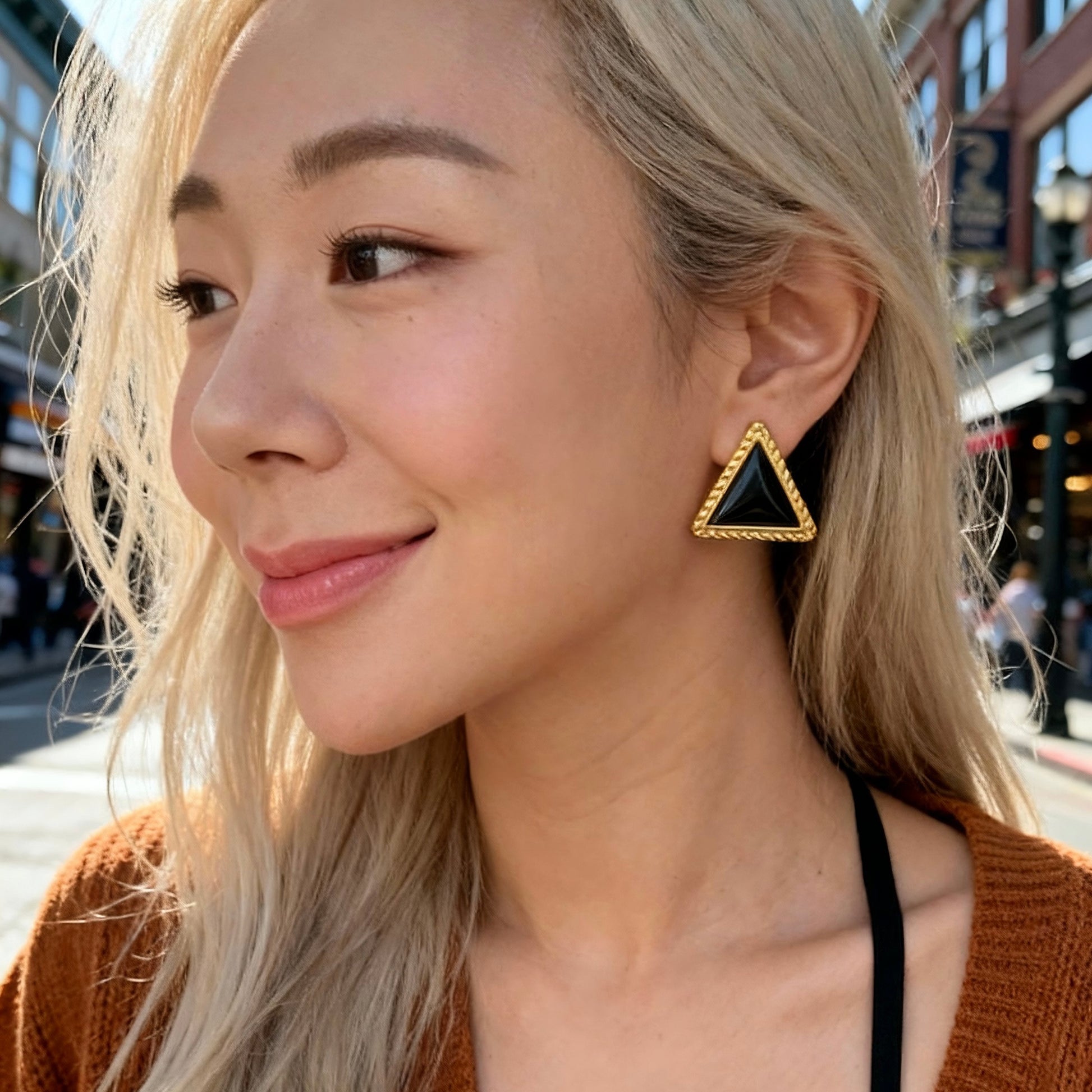 These black triangle stud earrings feature a sleek dark center framed by textured gold detailing. The sharp silhouette creates a confident, structured look that instantly elevates any outfit.