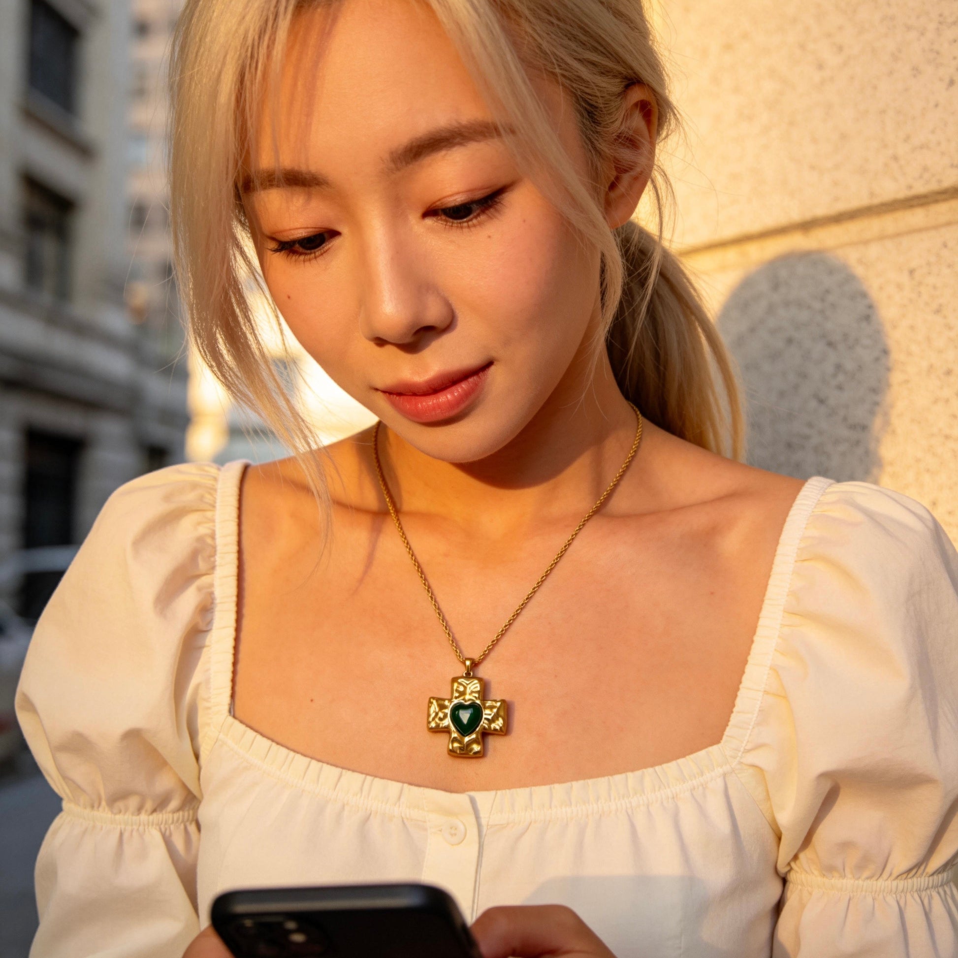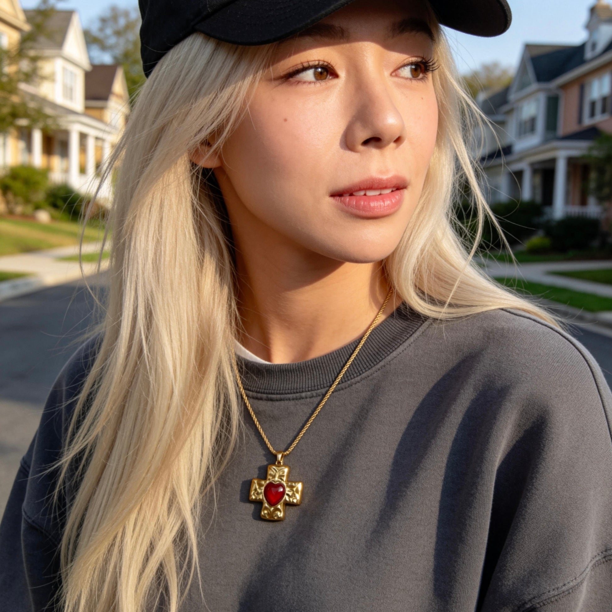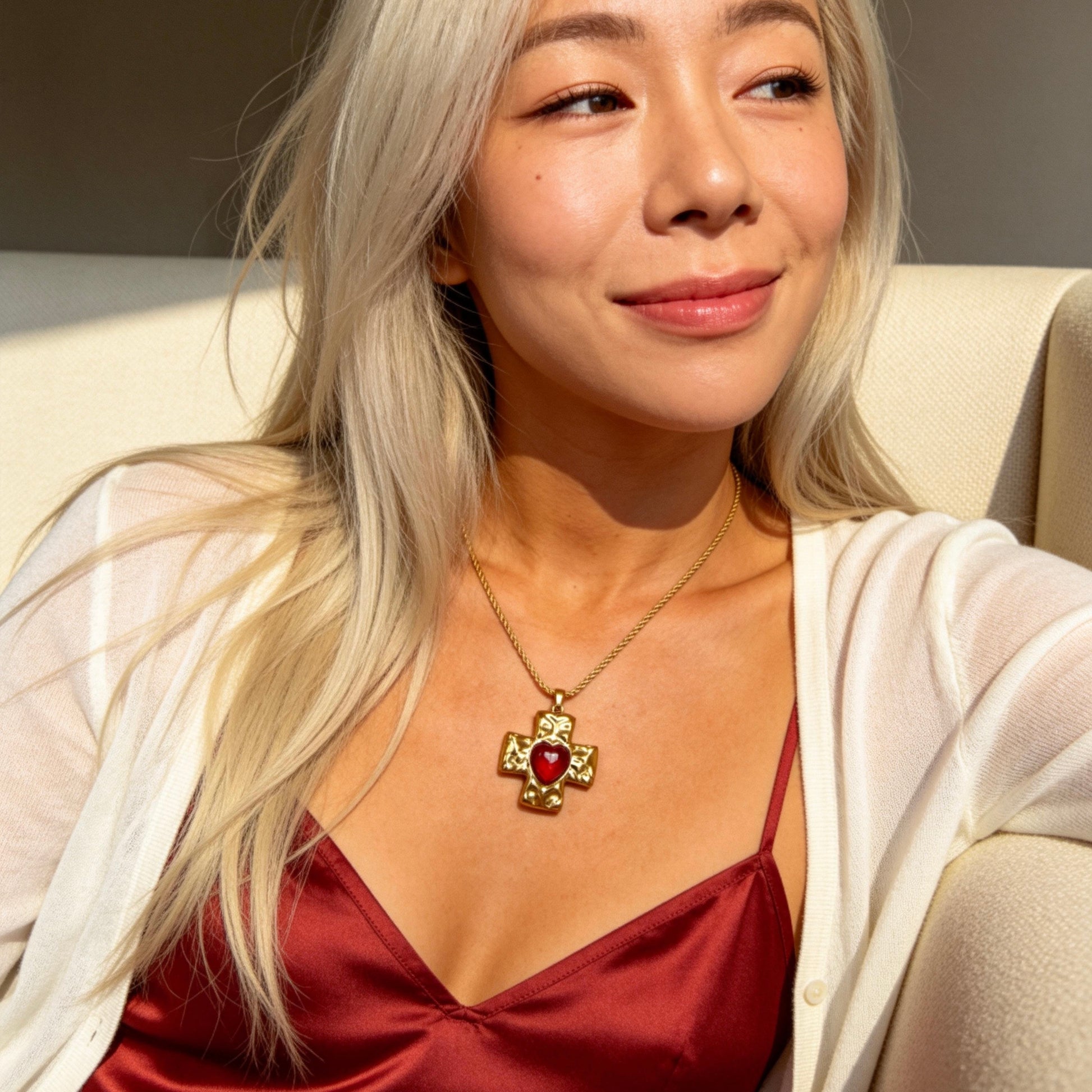 Vintage-inspired cross pendant necklace featuring a sculpted gold cross with a bold heart centerpiece. A symbolic statement piece that blends classic faith motifs with romantic vintage style.