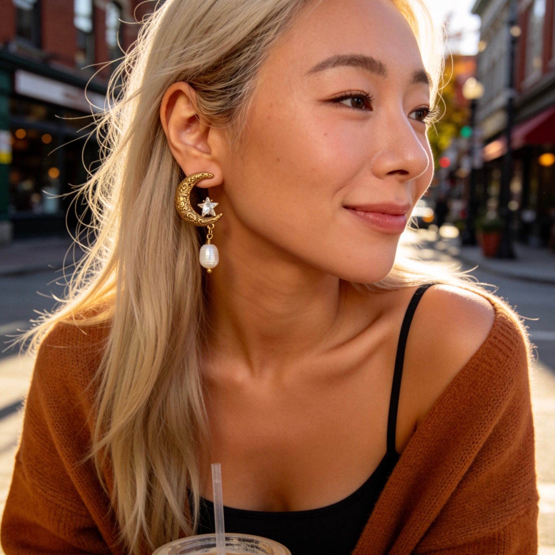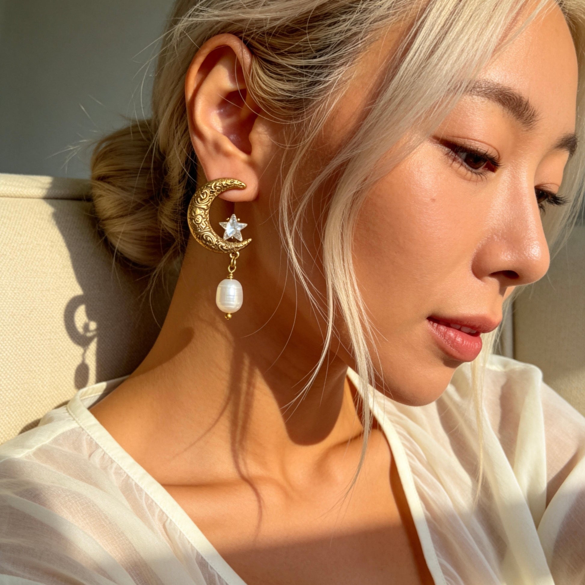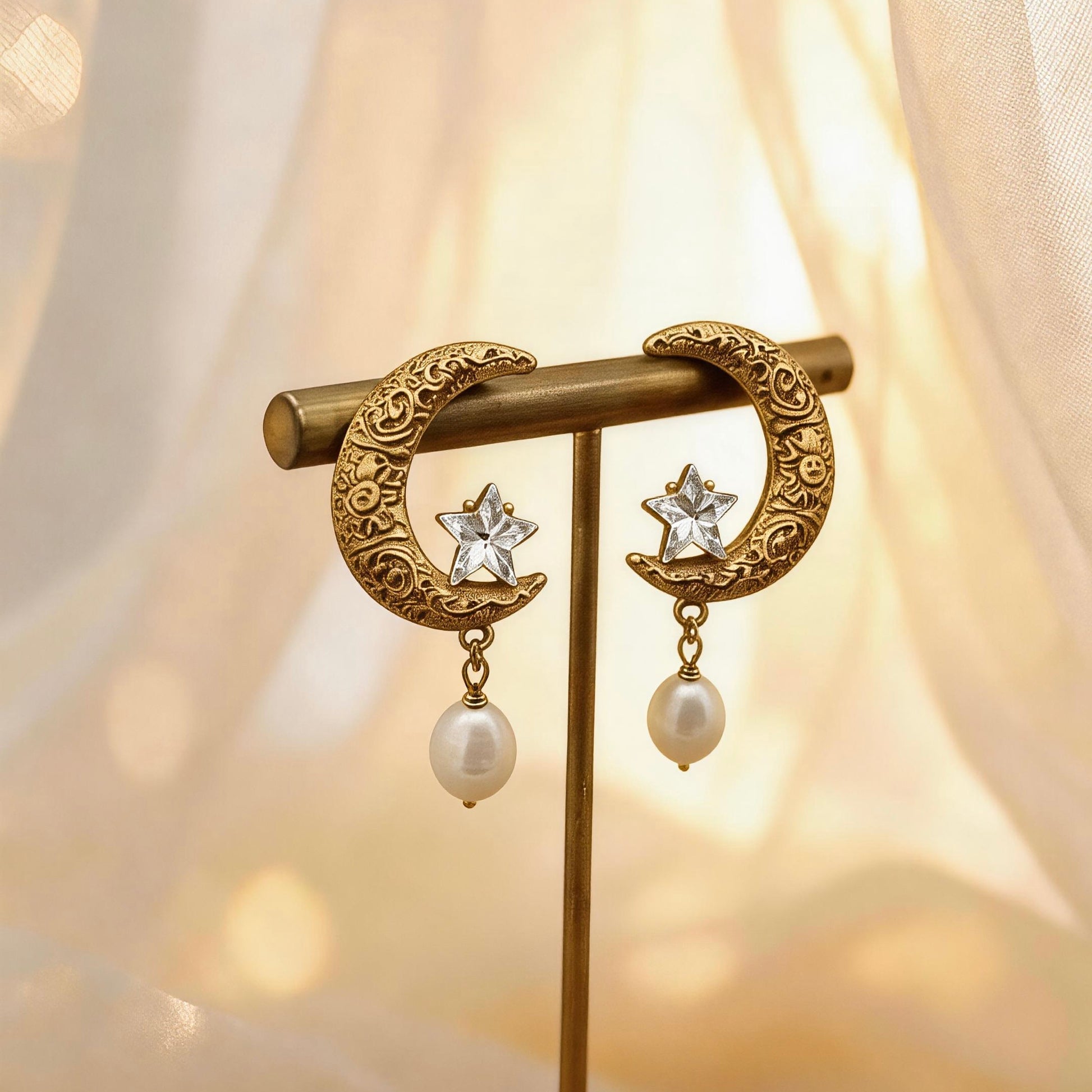 Vintage celestial earrings featuring an ornate crescent moon, star detail, and elegant pearl drops. A romantic statement piece perfect for adding dreamy vintage charm to everyday or evening outfits.