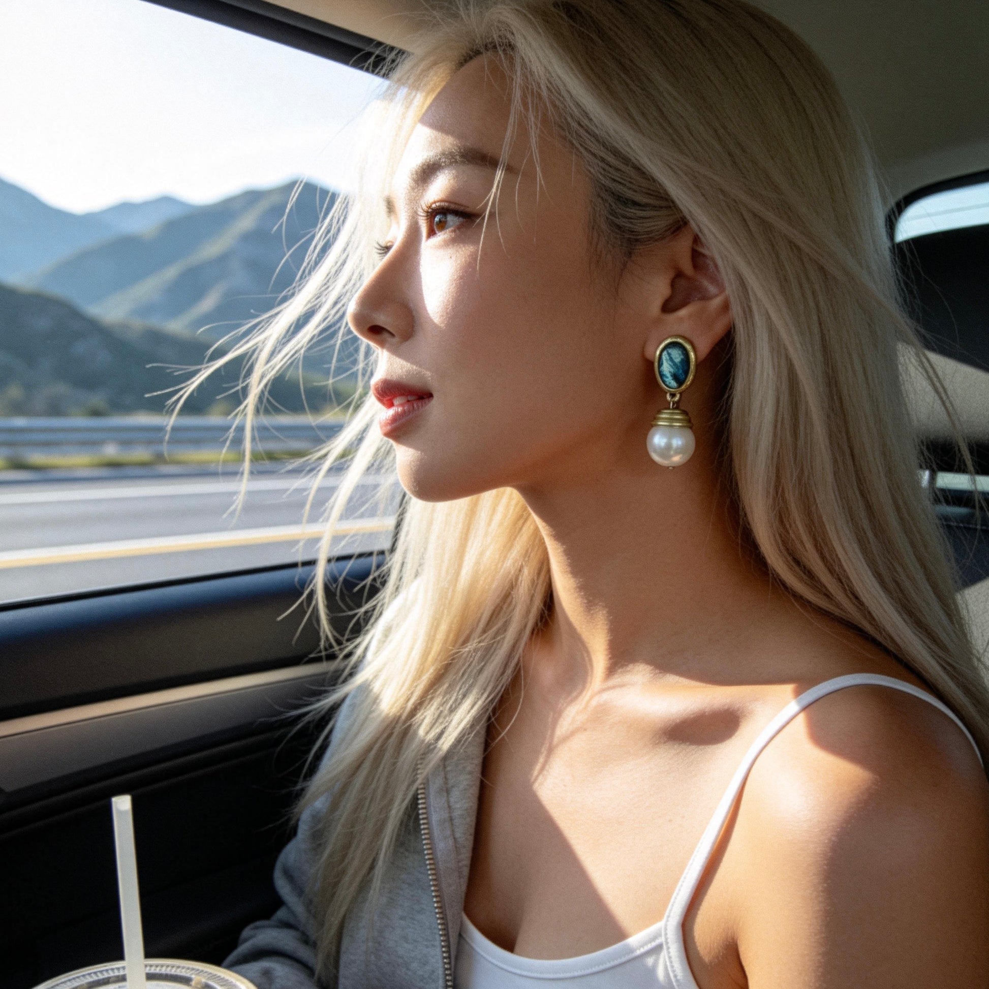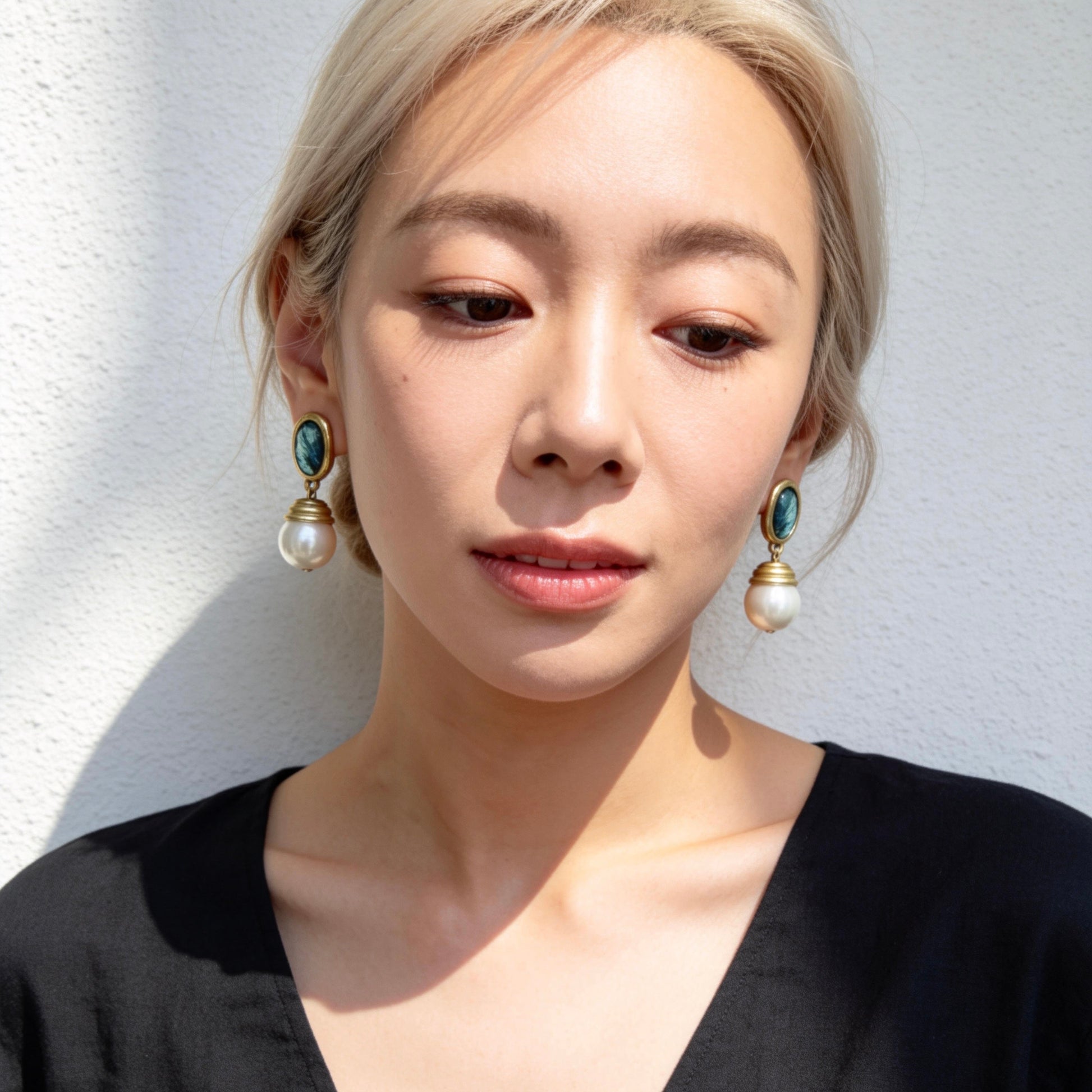 Elegant vintage drop earrings featuring marbled blue-green stones paired with luminous pearl drops. A timeless statement piece that blends classic romance with refined retro charm.