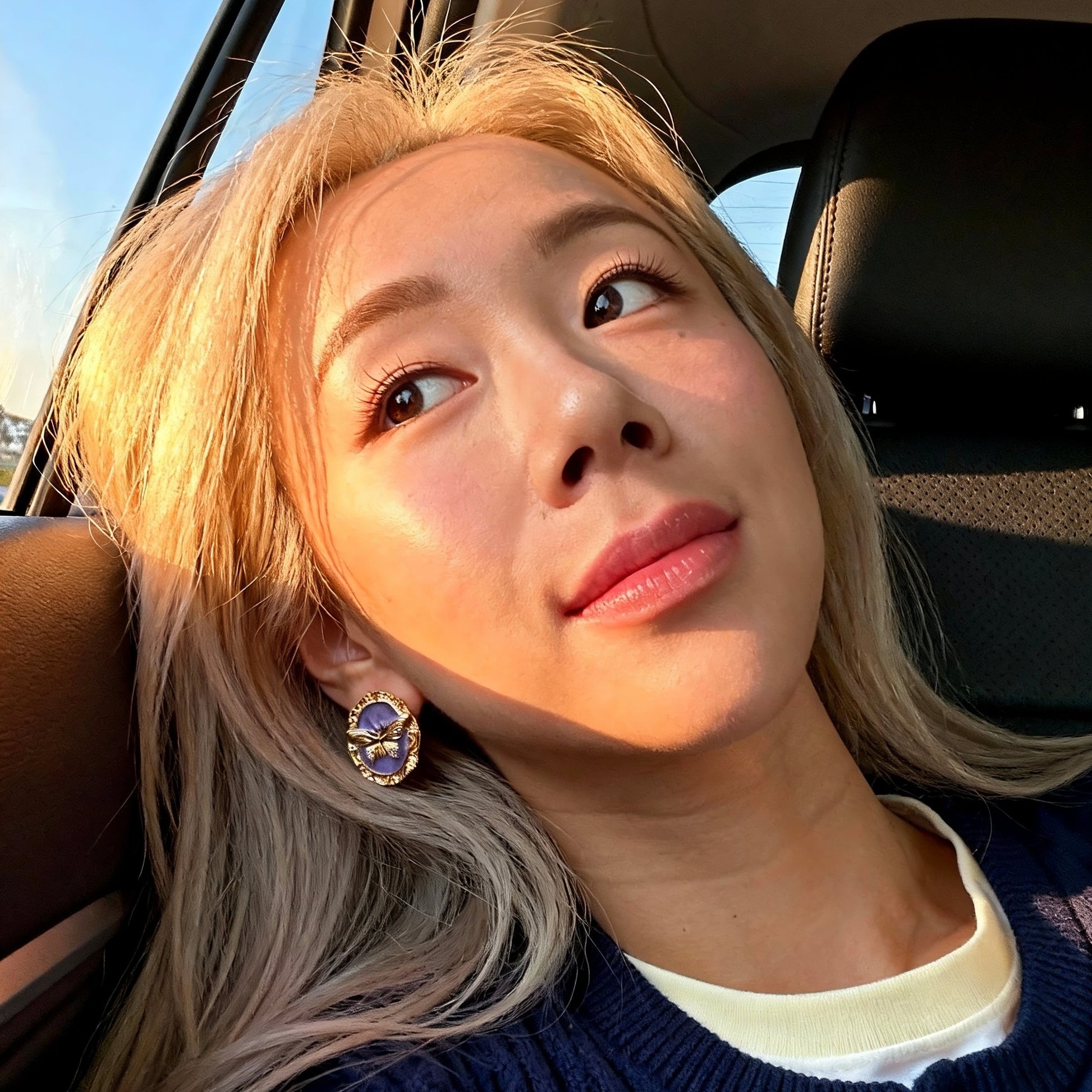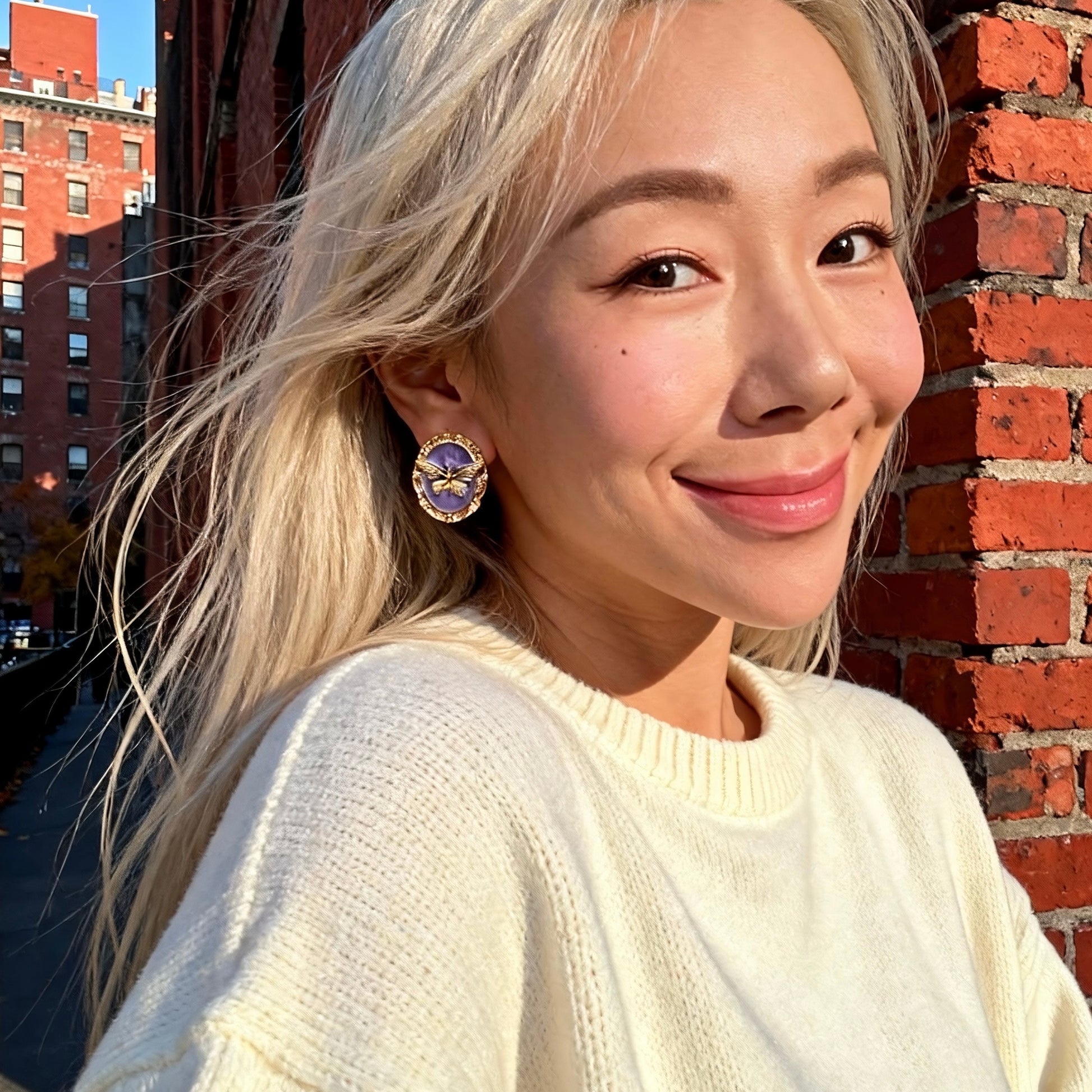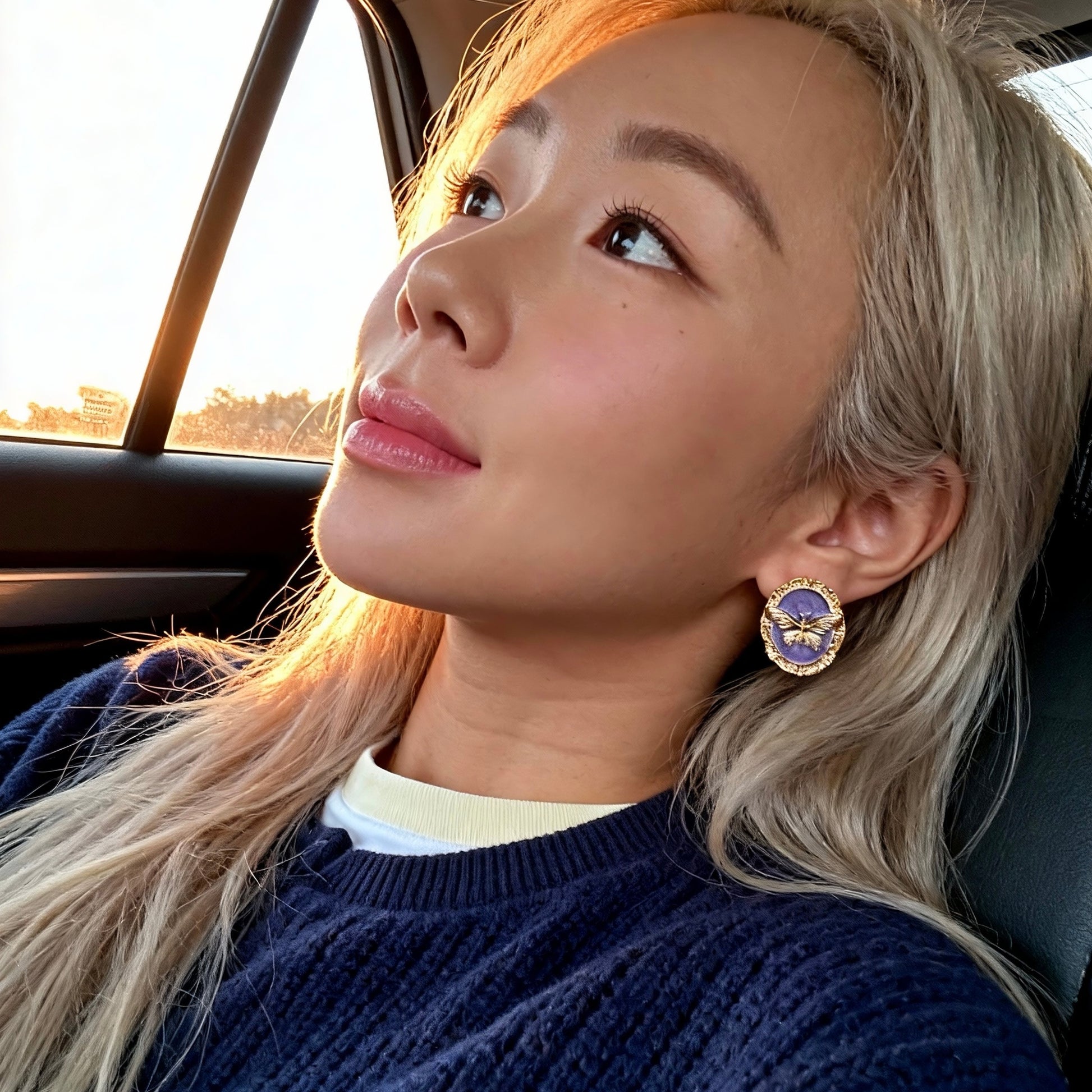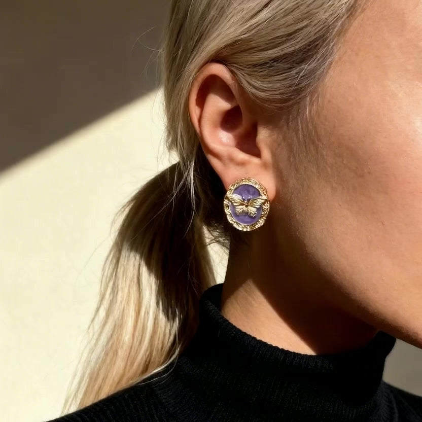A rich purple cameo background paired with a sculpted golden butterfly creates a striking baroque-inspired statement. Framed in ornate antique gold, these earrings blend vintage romance with bold character.